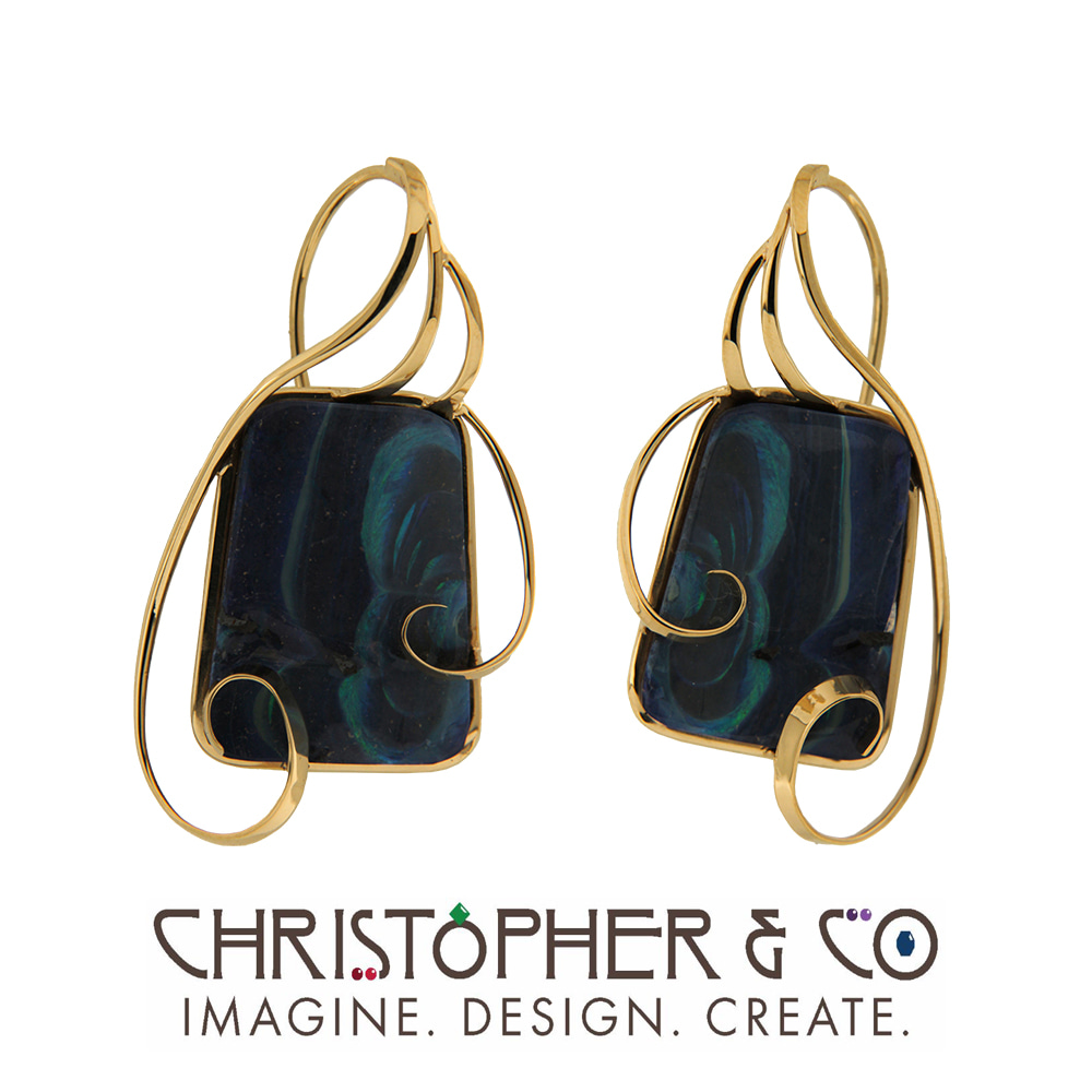 One pair of 14 karat yellow gold earrings designed by Christopher M. Jupp. The earrings are set with a 32.65 carat pair of boulder opal.