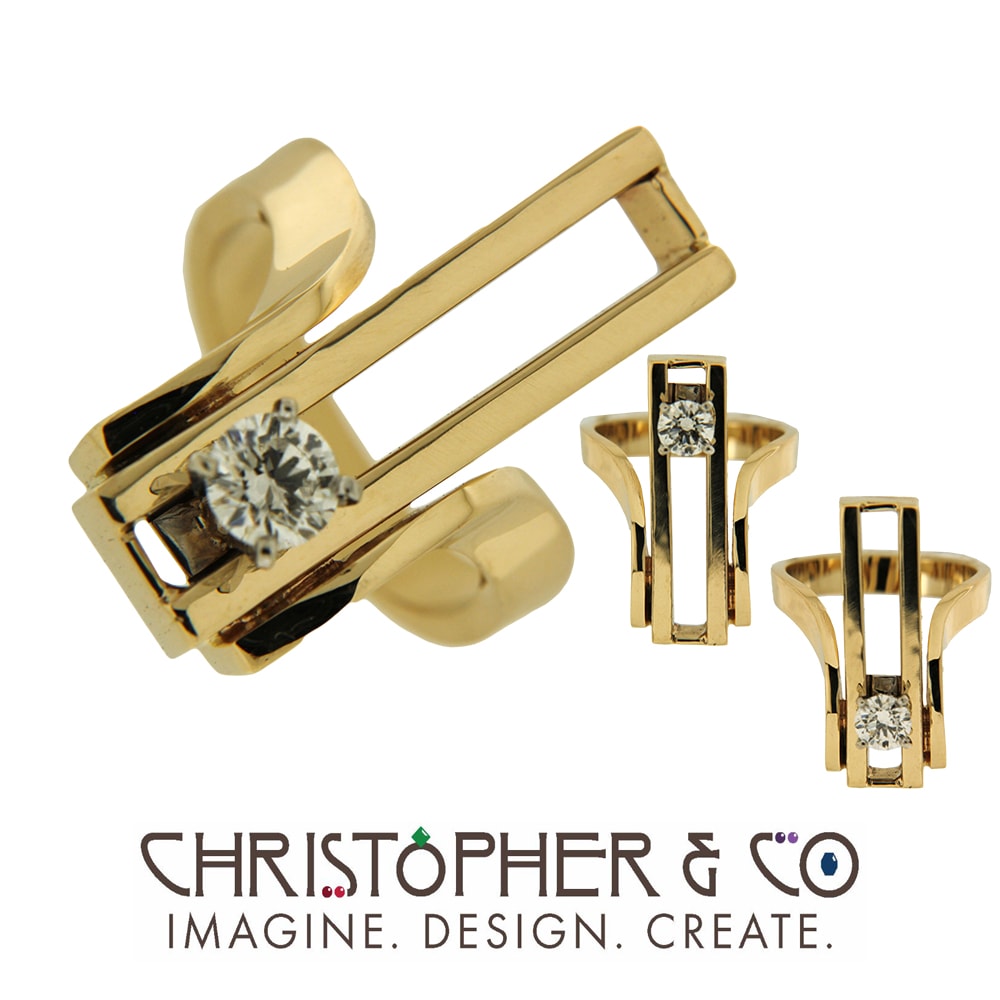 One 14 karat yellow gold sliding gemstone ring designed by Christopher M. Jupp. The ring is set with a brilliant cut gemstone which was supplied by the customer.