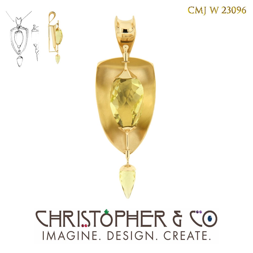 One 14 karat yellow gold pendant designed by Christopher M. Jupp. The pendant is set with one Oro Verde Citrine briolette cut by Richard Homer.
