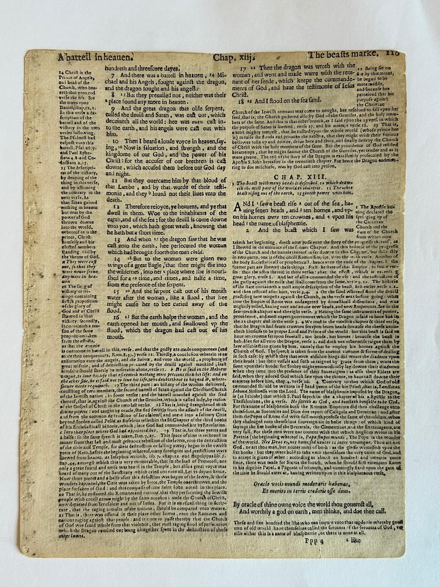 A folio from the so-called Breeches Bible published in Amsterdam in 1633 for the beginning of Chapter 13 from the Book of Revelation. This edition included the marinal notes of Franciscus Junius that emphasize Christological elements.