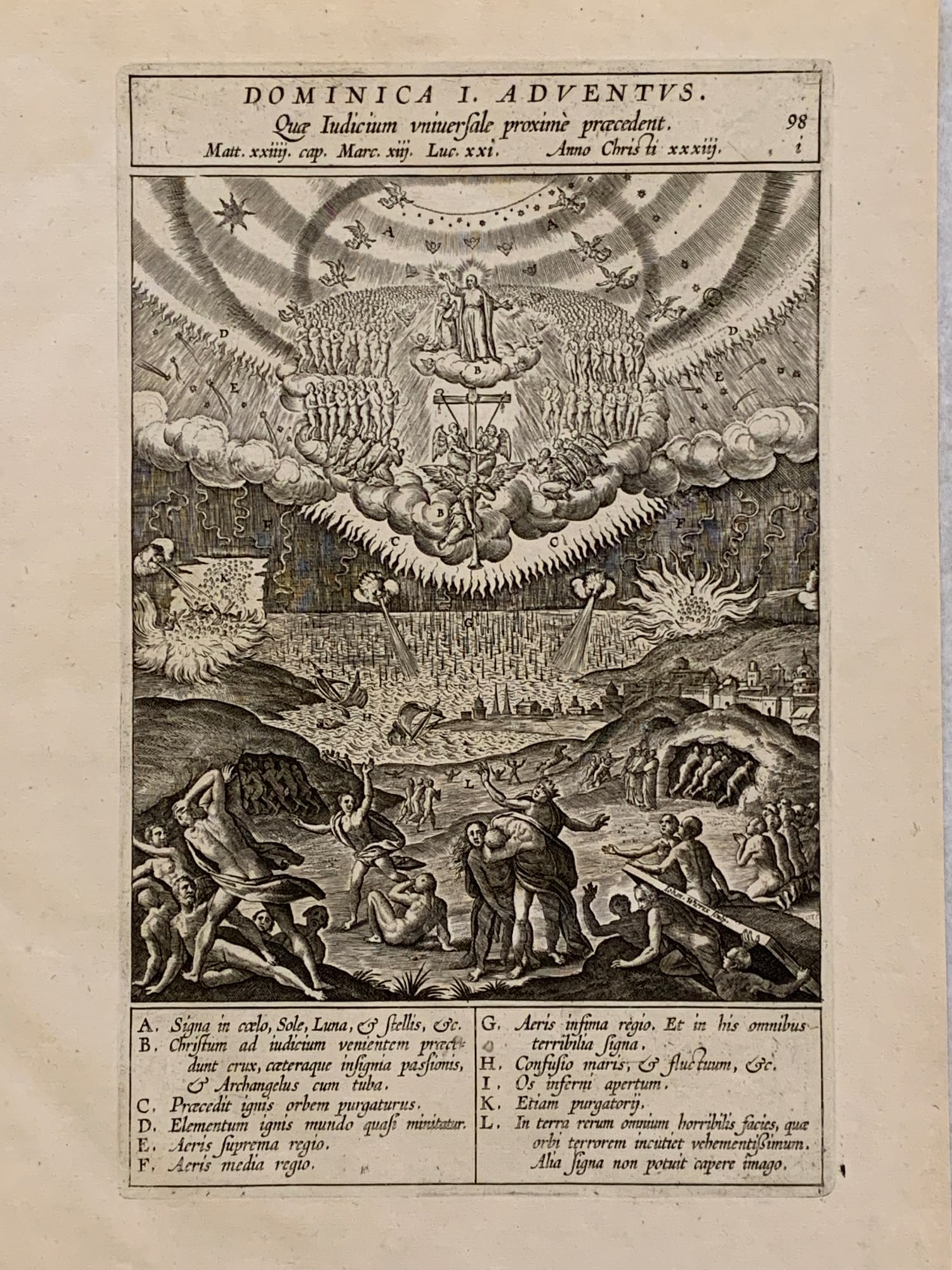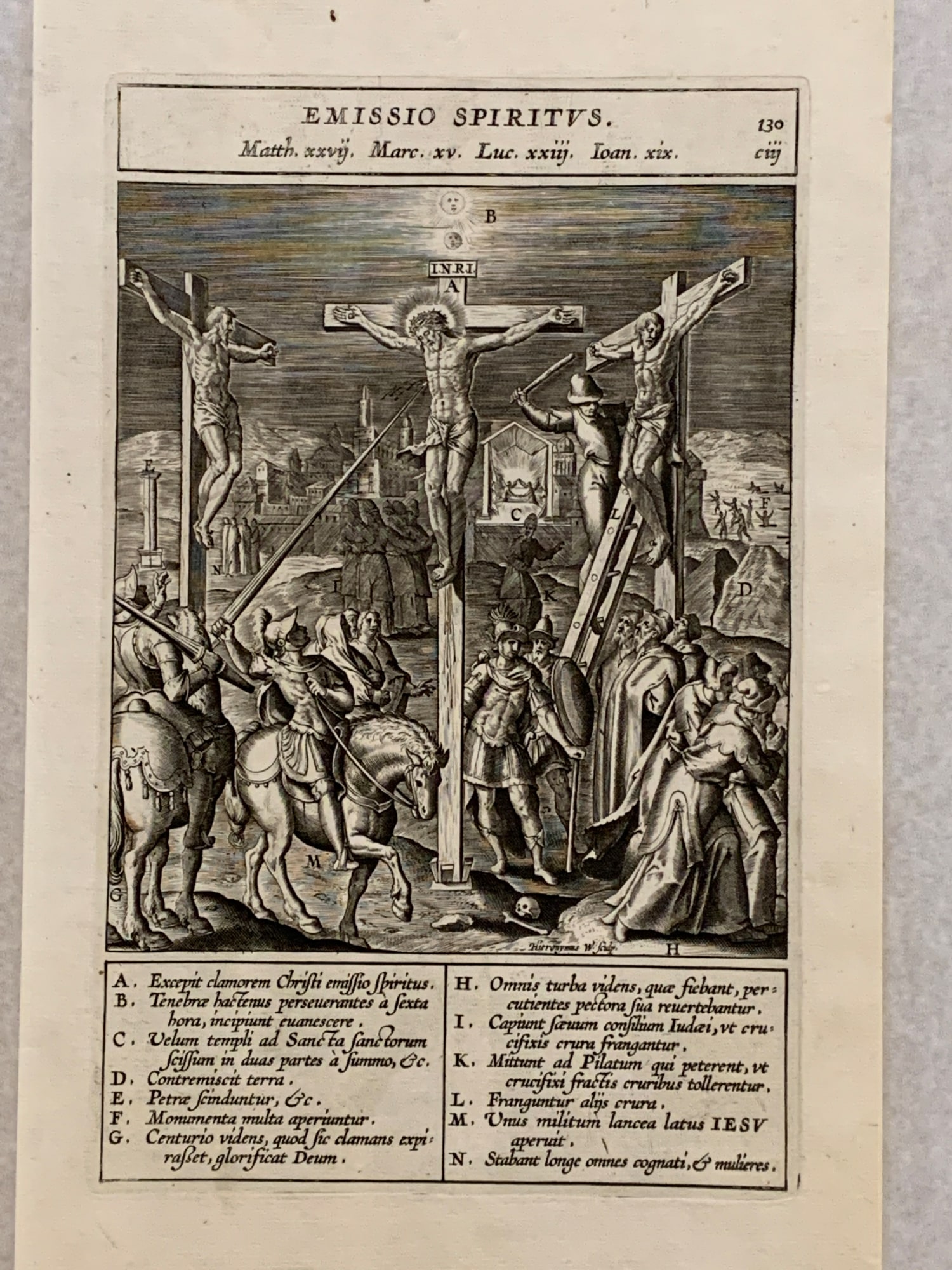 The illustrated work by Jerome Nadal, SJ (1507-1580), was written at the request of Ignatius of Loyola as a meditative propaedutic for the Jesuit scholastics. In 1593, Nadal published Evangelicae Historiae Imagines, which sequenced the events in Jesus' life with 153 plates. In 1594 and 1595, it was republished as, Adnotationes et Meditationes in Evangelia, with plates engraved primarily by Anton, Hieronymus, and Johannes Wierx, and more extensive text and rearranged according to the order of the readings used in the liturgical year. The set in Blackfriars Gallery includes plates 98, 99, 130, 131, 134, 148, 149, 152, and 153, all executed by the Wierx brothers, as indicated on each image. The folios are of two different sizes and types of paper, indicating two different sources. For an excellent article see Walter S. Melion, "Sublimia dona–sublimia mysteria: The Sublimity of Divine Speech in Jerónimo Nadal’s Adnotationes et meditationes in Evangelia," Journal of Historians of Netherlandish Art 8:2 (Summer 2016) DOI: 10.5092/jhna.2016.8.2.8