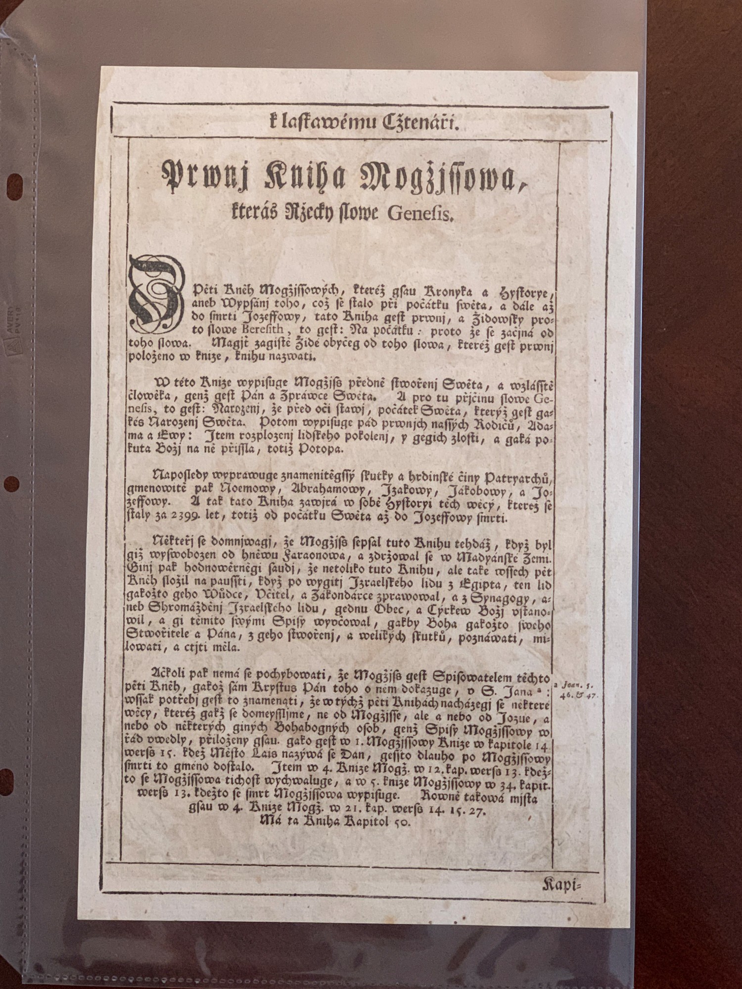 Folio from the Bible of Kralice (1579–1593), the first complete Czech translation of the Bible from the original languages by the Czech Brethren, became the model for the literary form of the language. The front page is an introductory page to the book of Genesis. At the very top “k laskawému Cztenáři” – “to the kind reader”. The two lines below read “The first book of Moses which is called by the word Genesis”. There follows a discussion of the role of Genesis in the Pentateuch, then a discussion about Moses.