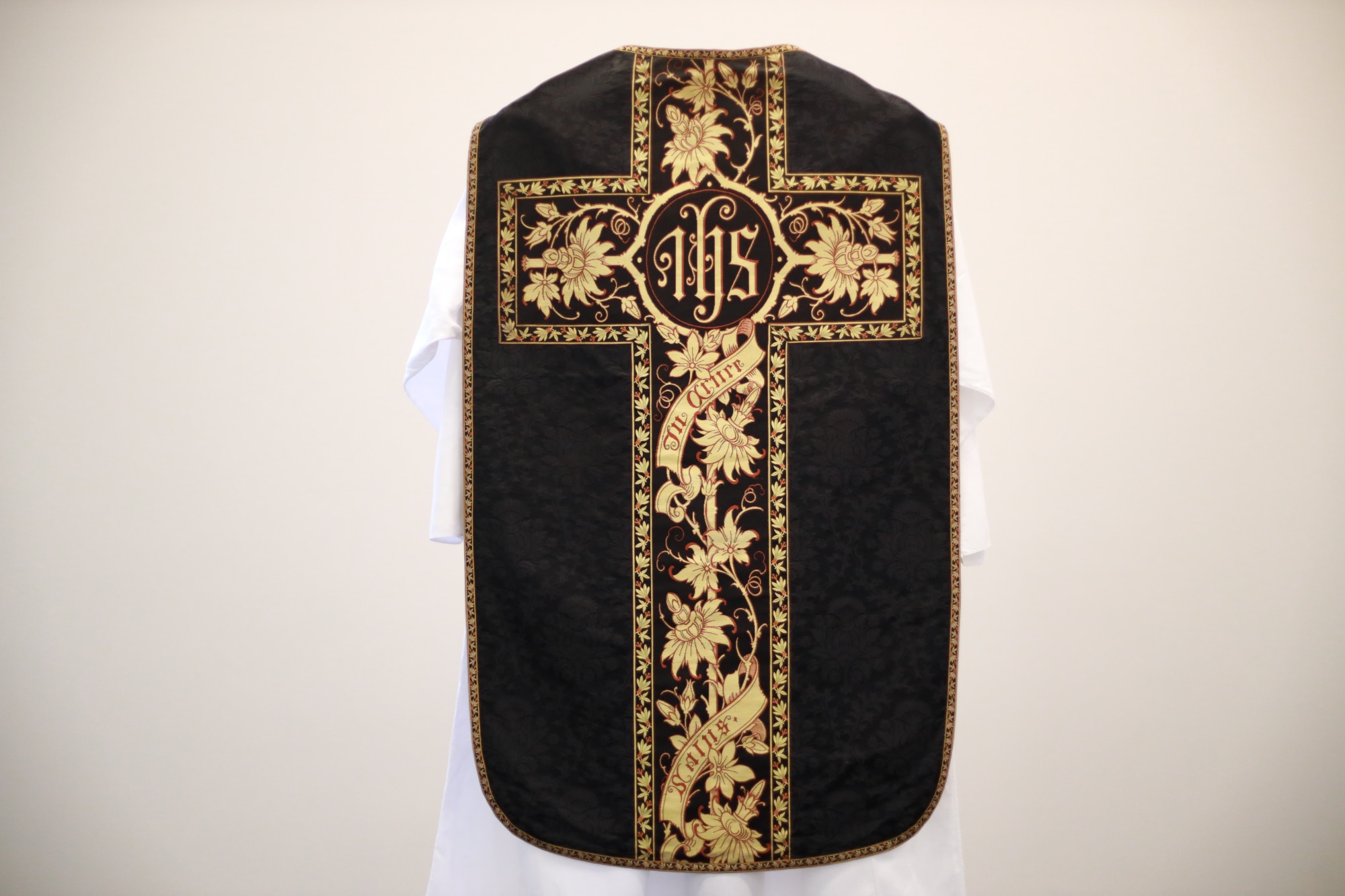 Fiddleback chasuble of unknown provenance; date as suggested by vestments of similar style in the auction catalog, "Collection Florand - paramentique& beatilles, canivets & paperoles," Drouot-Richelieu, 7 Nov 2000, Nos. 91, 123.