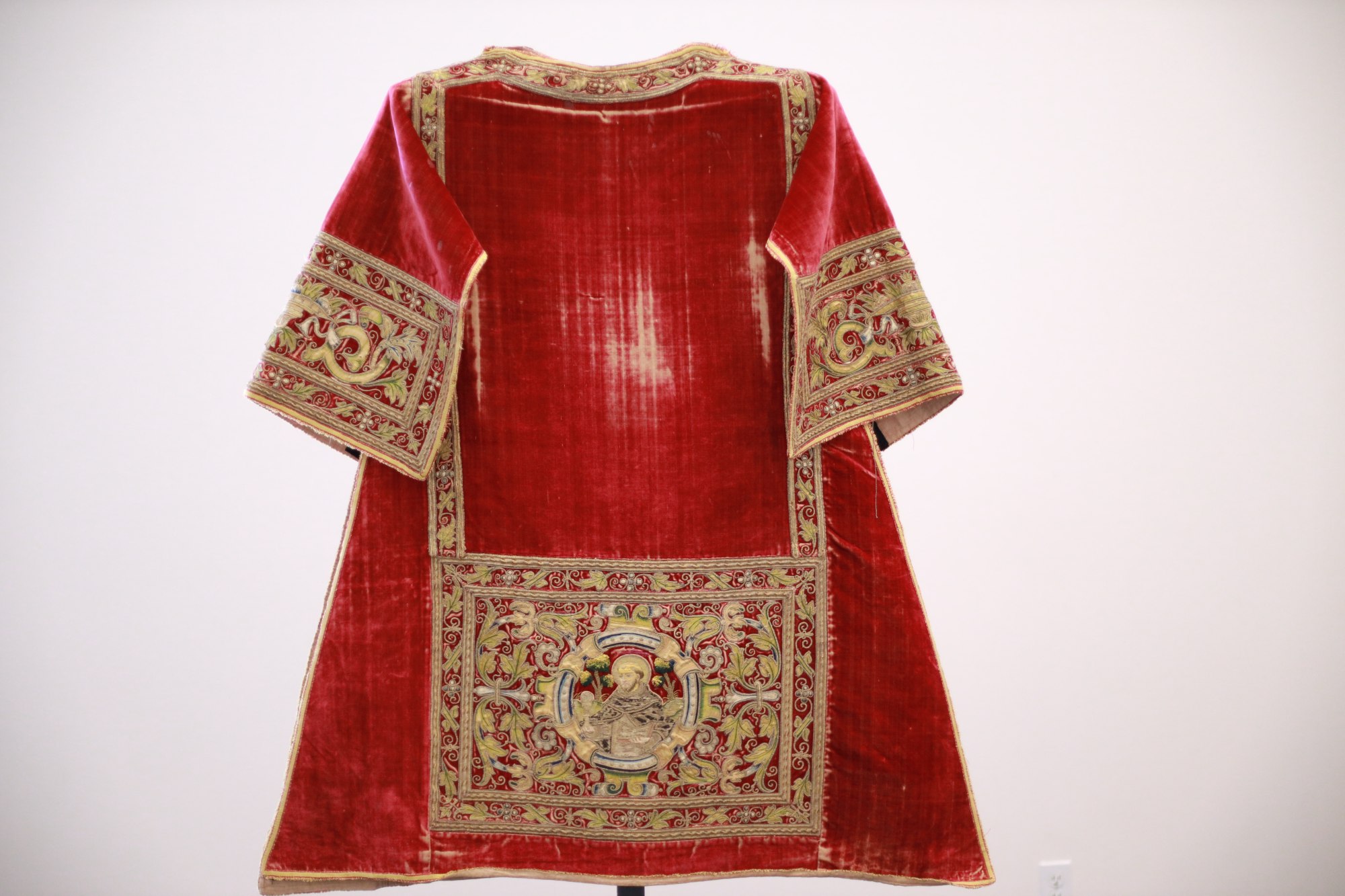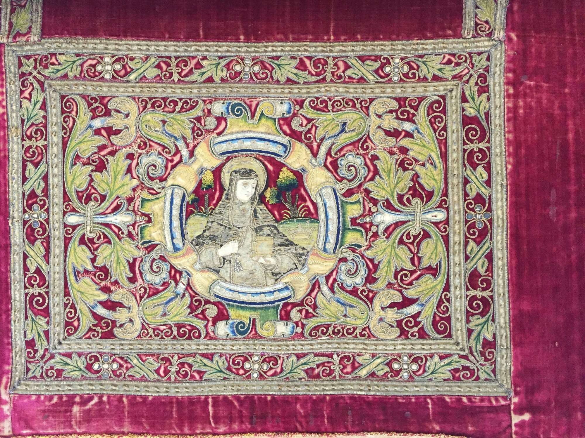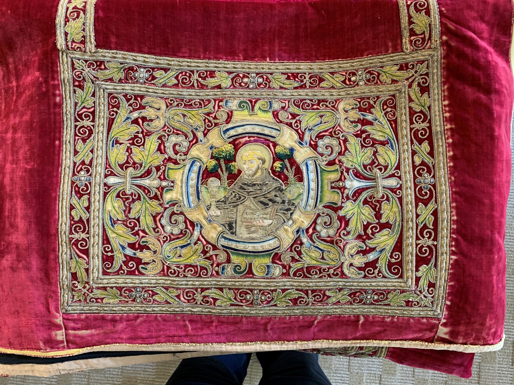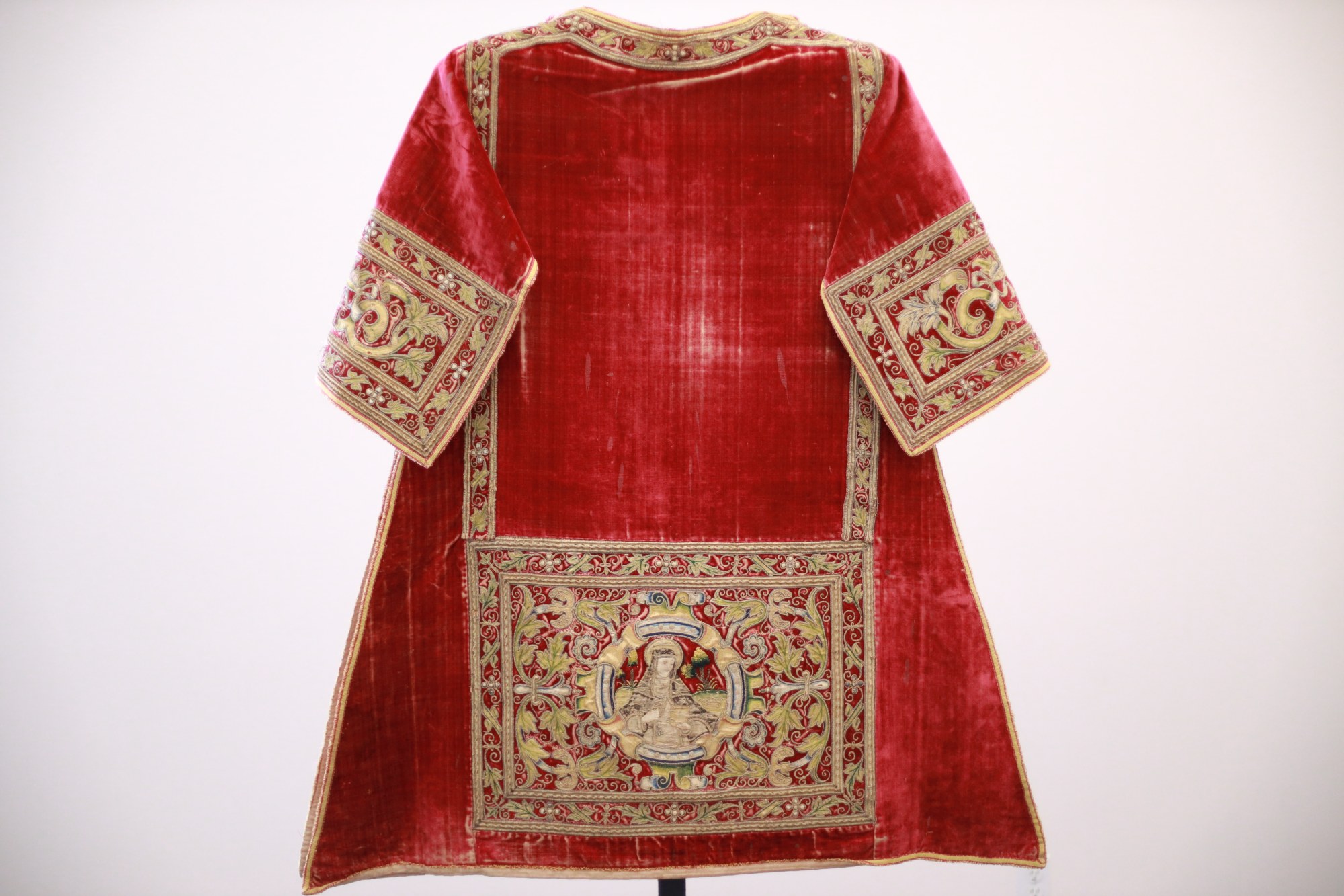 Gold metal on red velvet. Apparels are of S. Catherine and S. Thomas Aquinas, with Or Nue' embroidery. Lined with heavy yellow linen. Dating is based on a similar 17th c. Spanish dalmatic at The Met, Robert Lehman Collection.