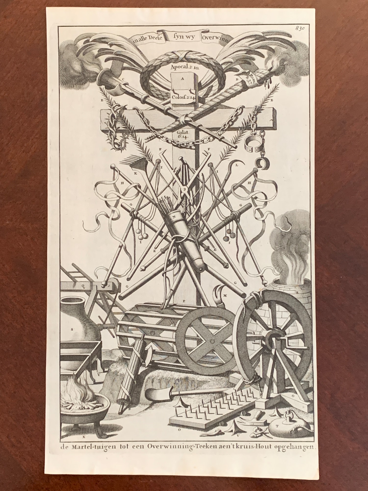 From Constantine de Groot, Voor-bereidselen tot de Bybelsche wysheid, en gebruik der heilige en kerklijke historien (Utrecht: Anthony Schouten and Hermannus Ribbius), p. 830. Illustration of the arma Christi, with scriptural references from Rom. 8: 37 ("No, in all these things we are more than conquerors through him who loved us."); Rev. 2:10 ("Do not fear what you are about to suffer."); Col. 2:14 ("erasing the record that stood against us with its legal demands. He set this aside, nailing it to the cross."), and Gal. 6:14 ("May I never boast of anything except the cross of our Lord Jesus Christ, by which the world has been crucified to me, and I to the world.").
