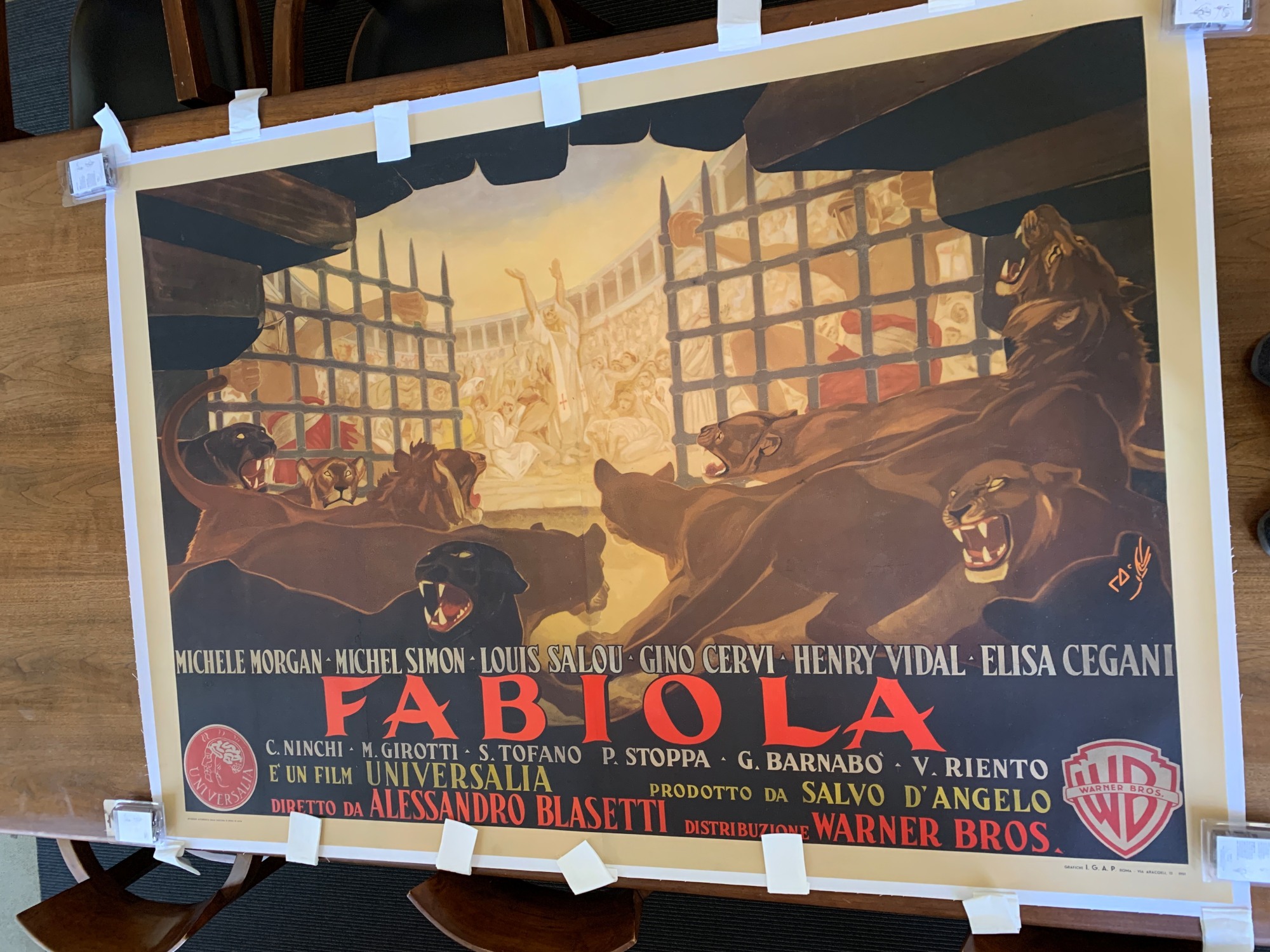 Grafice I.G.A.P. Roma. Mounted on linen with loops for display. Poster for 1951 Italian re-release of Fabiola. The image features a creative take on the film’s famous Roman Coliseum scenes—from the perspective of the lions about to be released on the Christians.