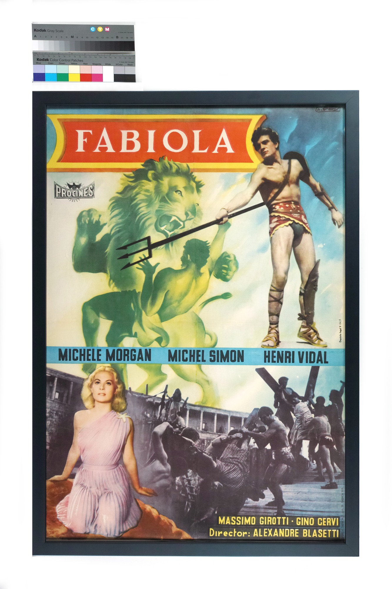 Graficas Valencia. Along with the attacking lion graphic repeated from the original 1949 Spanish Art Deco "red" Fabiola poster designed by Ramon, this one, created for the 1959 re-release, includes colorized stills from the film of the two main stars, Michele Morgan and Henri Vidal, as well as a black and white still of crucifixion.