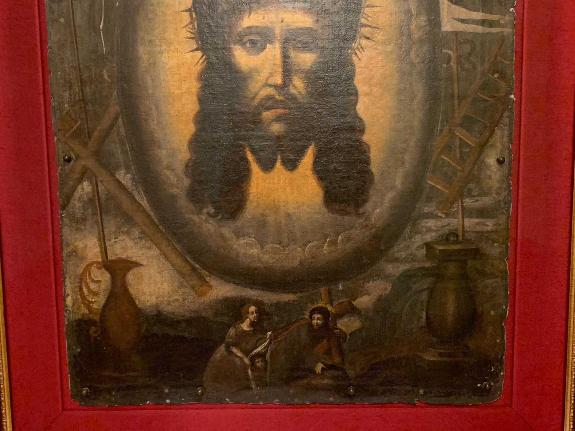 Holy Face with Arma Christi. Provenance unknown but thought to have been painted by an anonymous Peruvian artist. The painting was purchased by Fr. Michael Morris, OP from an unidentified community of Carmelite nuns in Lima, Peru. It arrived in very poor condition and was professionally restored and framed.
