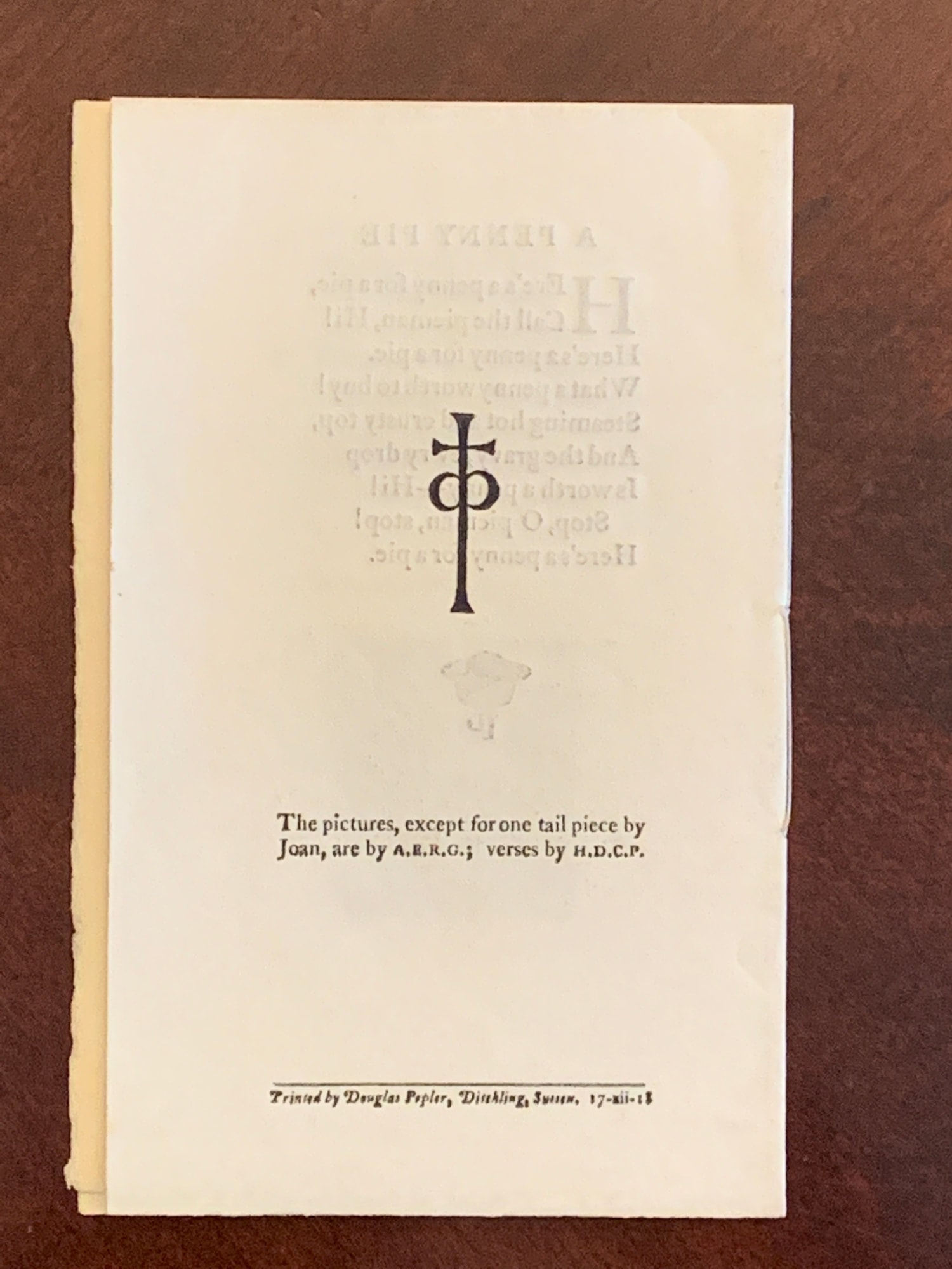 With three Gill engravings: Madonna and Child I Vesica (P143 with lettering "J" "M" "J" and "D") on front cover, P144, P64, and one other engraving. Sewn without covers. Includes a note on back :The pictures, except for one tail piece by Joan, are by A.E.R.G.; verses by H.D.C.P. Printed by Douglas Pepler, Ditchling Sussex, 17-xii-18. Top not cut.