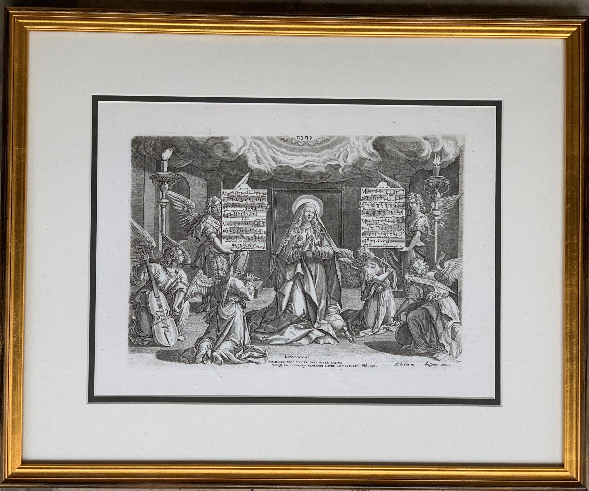 "Magnificat," an engraving by Jan Sadeler, after Maarten de Vos, published by Claesz Jans Visscher (1587-1652). Using the muscial setting of the "Magnificat" by the Flemish composer Cornelis Verdonck (1563-1625), the piece represents one of the earliest artistic illustrations of music engraving. The score includes alto and base parts on left tablet, and soprano and tenor on right tablet. Two angels singing are accompanied by our angels playing the violin, flute, cornetto. Visscher published several illustrated bibles during the 17th century, the most important beingTheatrum Biblicum.