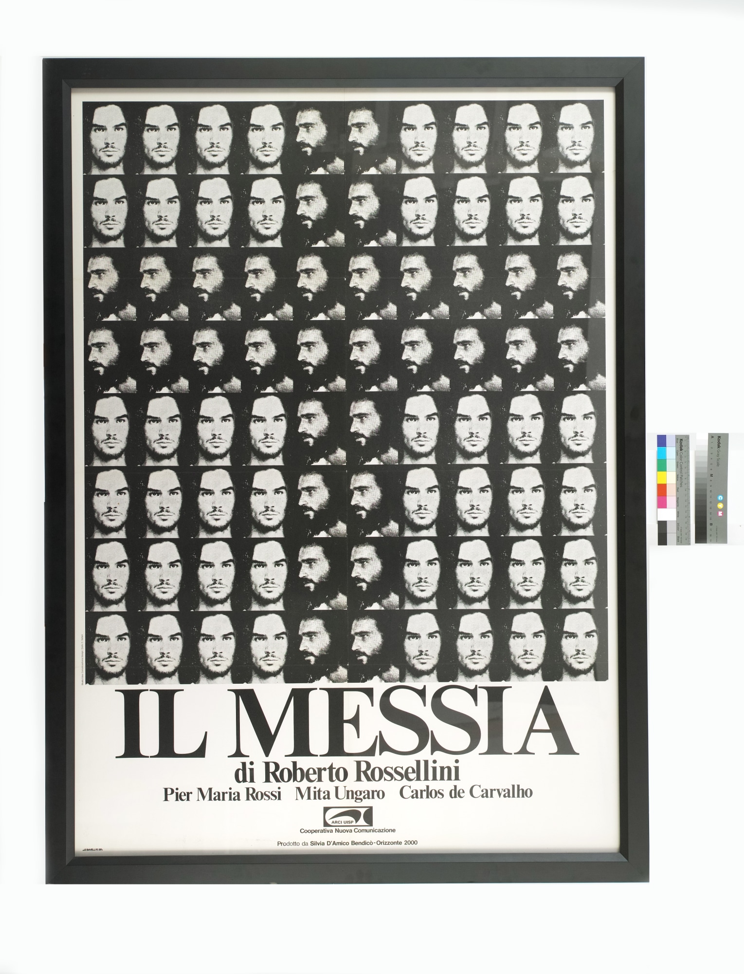 Poster for Italian director Roberto Rossellini’s depiction of the life of Jesus Christ. The poster features the actor who plays Jesus, Pier Maria Rossi, in frontal shot and profile, echoing the style of Andy Warhol’s repeated portraits of celebrities. It was the last feature film of Rossellini’s illustrious career.