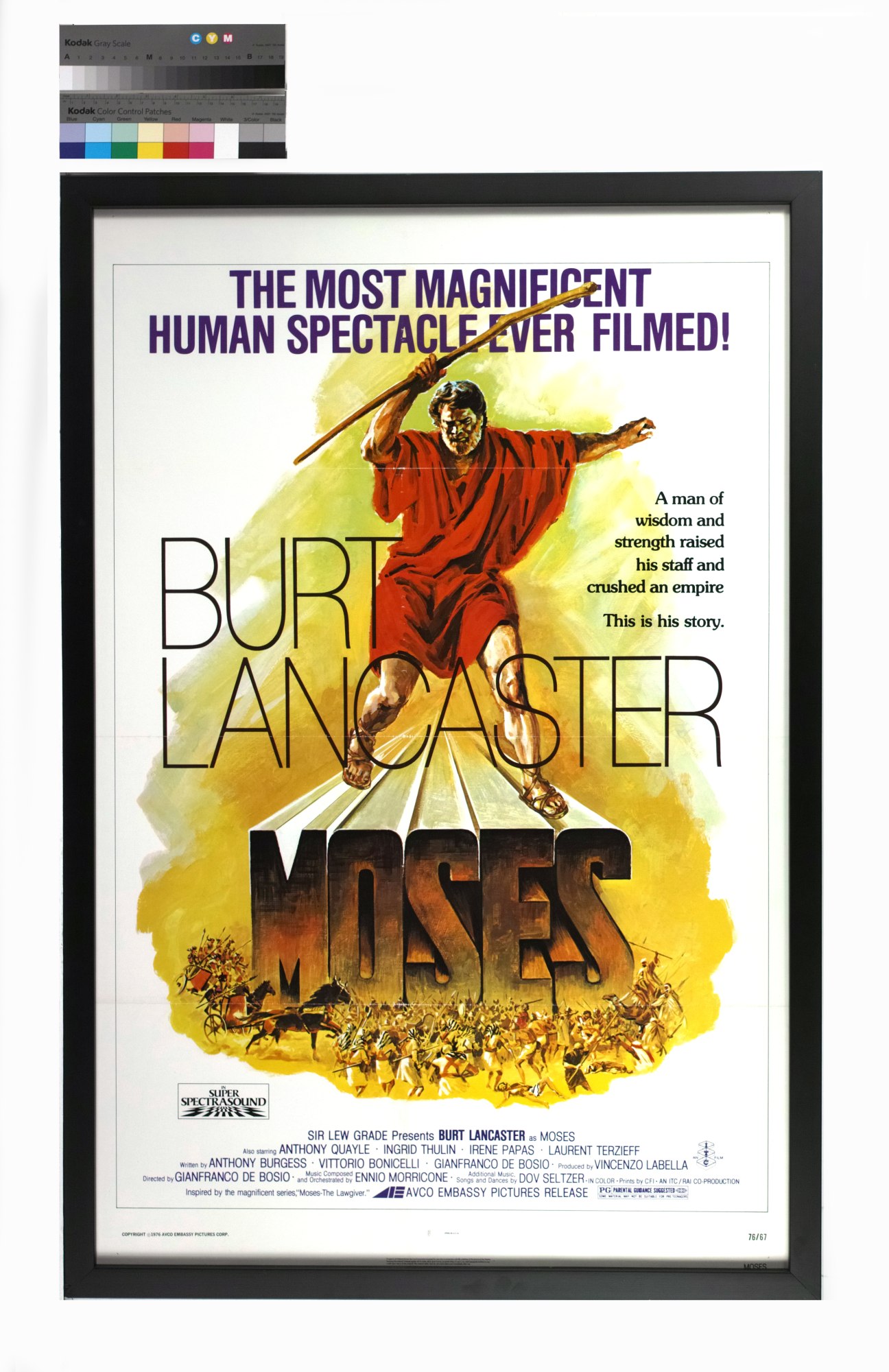 Avco Embassy Pictures, Corp. 76/67. This poster is for the edited-down, theatrical version of the original Italian/British co-production of a six-hour mini-series entitled Moses the Lawgiver. Directed by Gianfranco di Bosio, it starred Burt Lancaster as Moses, Irene Papas as his wife Zipporah, and Lancaster’s son William as the young Moses. The poster casts Moses (and his name) as larger than life figures that tower over images of battle between the Egyptians and the Israelites. The poster’s claim to being the “most magnificent human spectacle ever filmed” is within the hyperbolic tradition of Hollywood epic films. Most critics felt the actual series/film, however, paled in comparison to classics of the genre like Cecil B. DeMille’s The Ten Commandments.