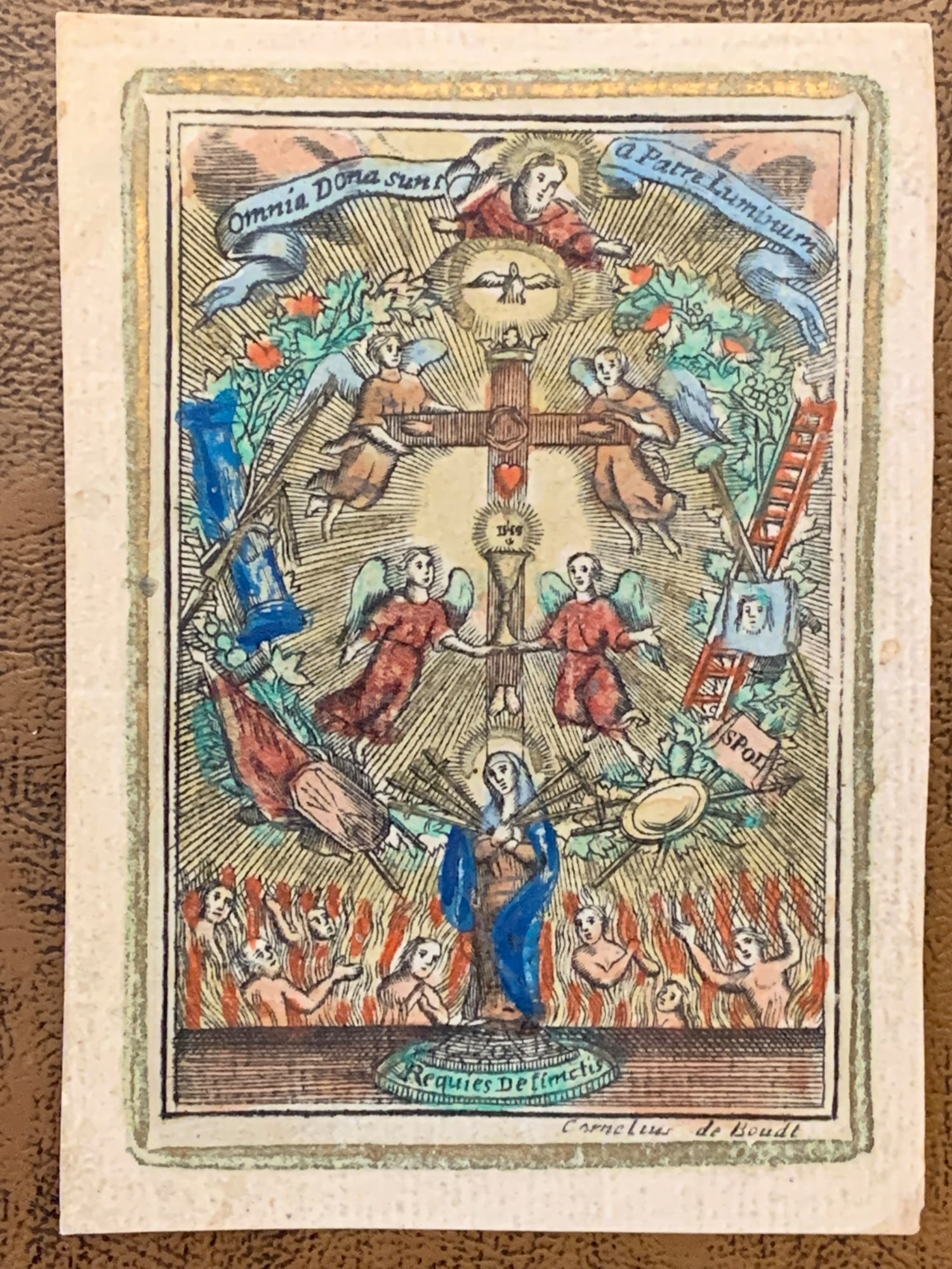 "All Gifts Are From the Father of Lights." The image depicts Mater Dolorosa with seven sorrowful wounds (swords) and armor Christi, looking down on souls in purgatory. This small but powerful prayer card offers a direct visual (and catechetical) connection between Mary's suffering, the Paschal Mystery (the suffering of Christ on the cross), and the Eucharist. It also offers a direct liturgical connection to 2 related feasts - The Triumph (Exaltation) of the Cross (September 14) and Our Lady of Sorrows (September 15).