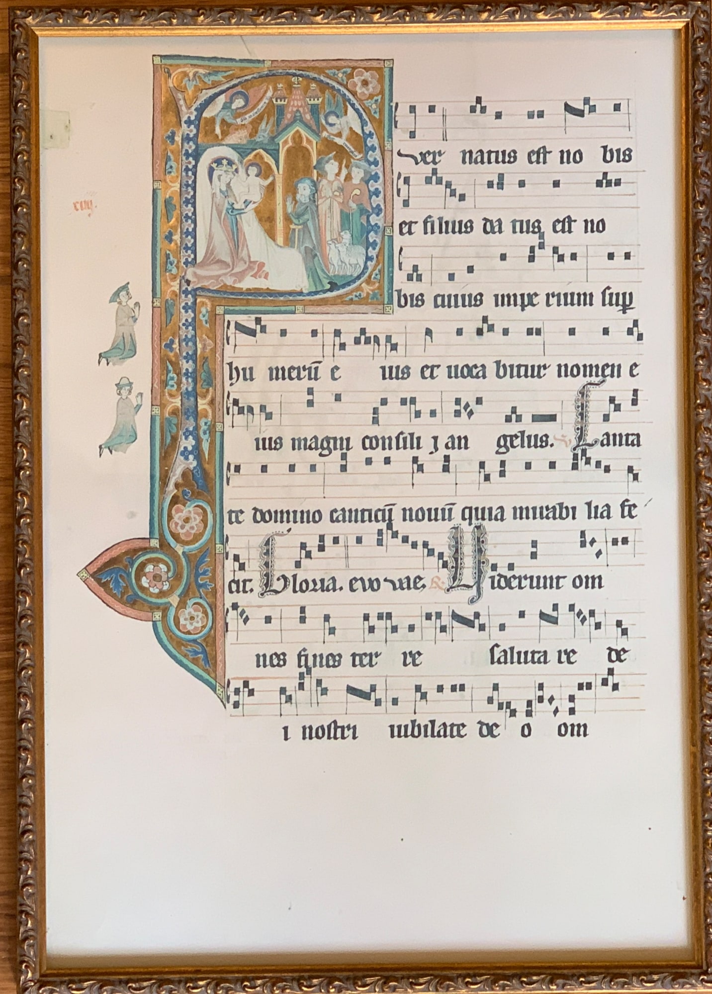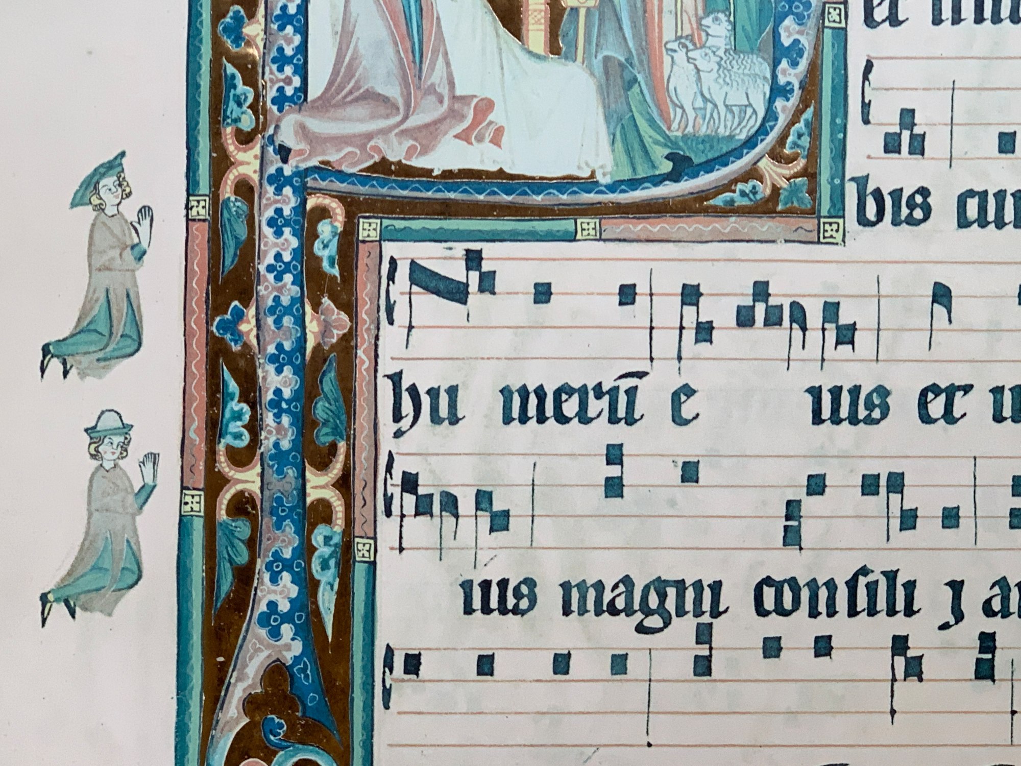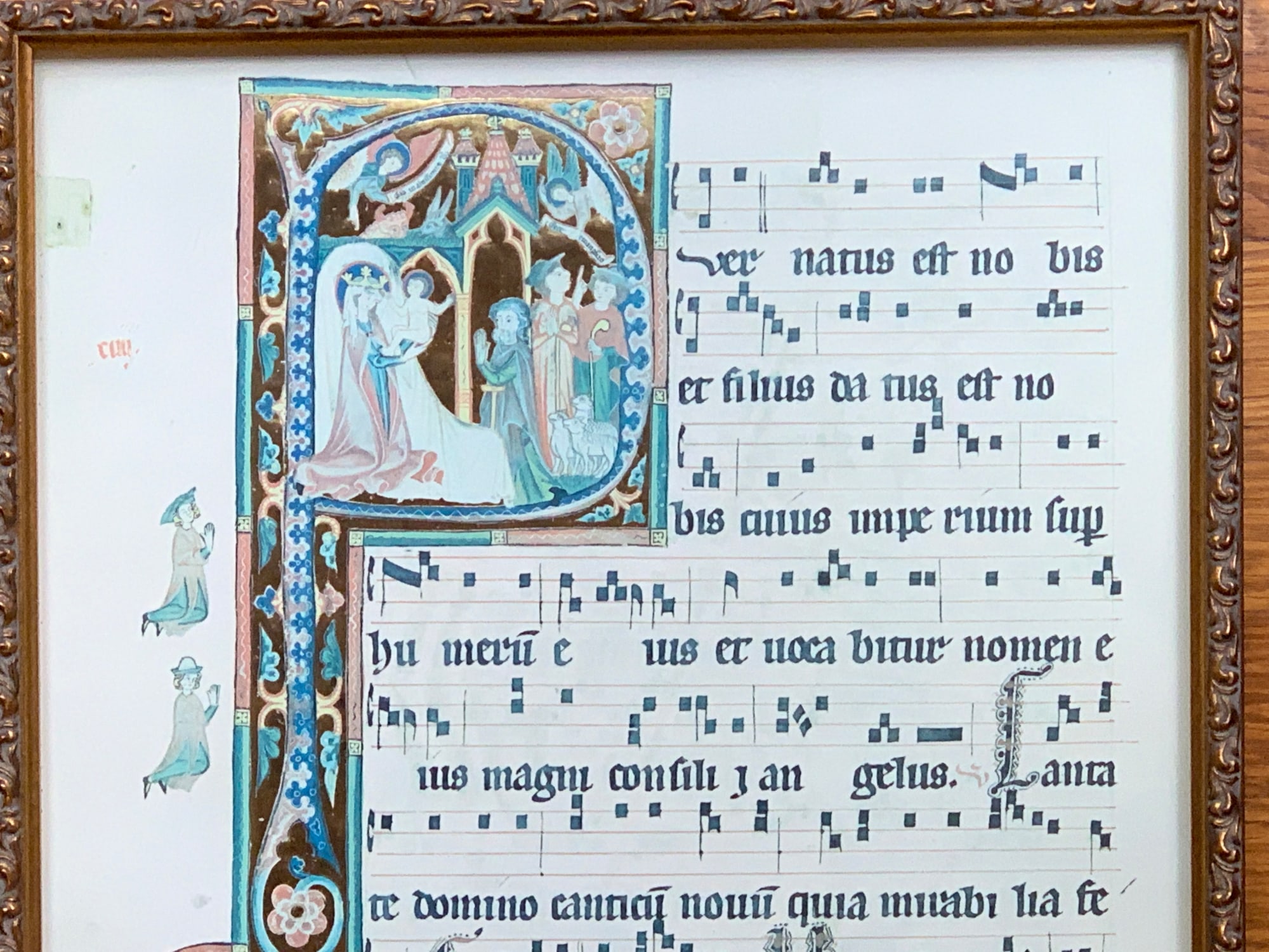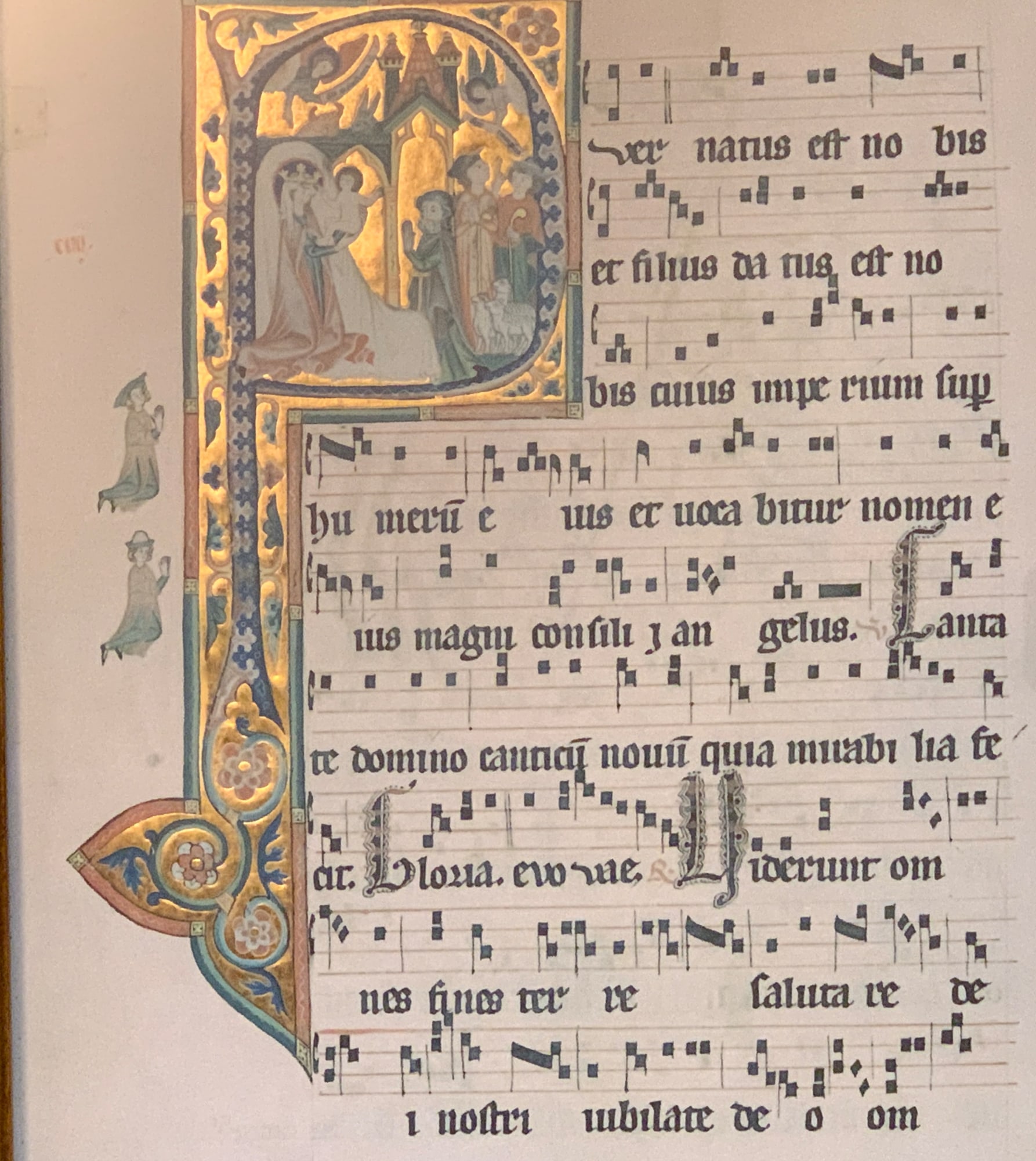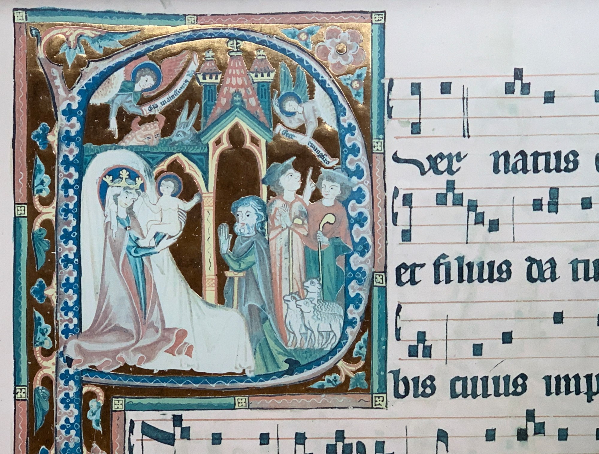 Introit for Christmas (Dec 25): Puer natus est nobis, Et filius datus est nobis: Cuius imperium super humerum eius: Et vocabitur nomen eius, Magni consilii Angelus. Folio 18v in original graduale.