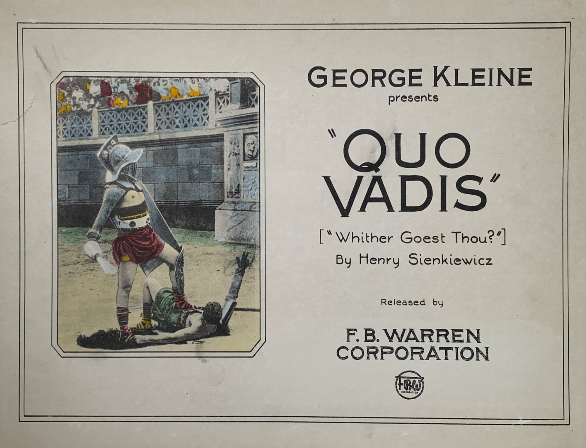 The first 1913 Italian silent film version Quo Vadis? was directed by Enrico Guazzoni, and starred Carlo Cattaneo as Nero. A previous silent Quo Vadis? (1901), was directed by Lucien Nonguet and Ferdinand Zecca for the French company Pathé. As illustrated in this lobby card, George Kleine brought Quo Vadis? to New York City in 1913 where he showed it at The Astor Theatre, a legitimate Broadway venue. The top ticket price was an unheard-of $1.00.
