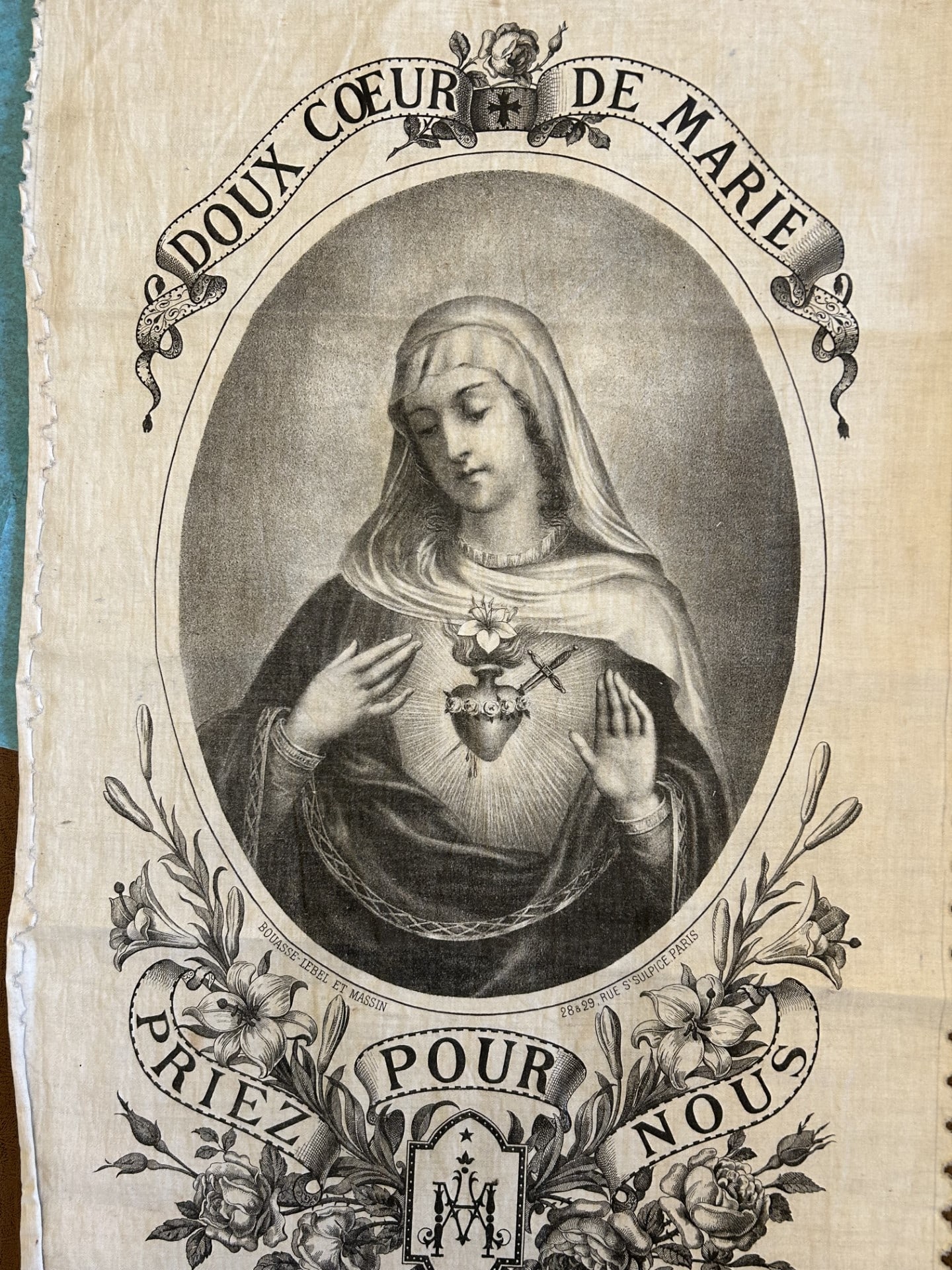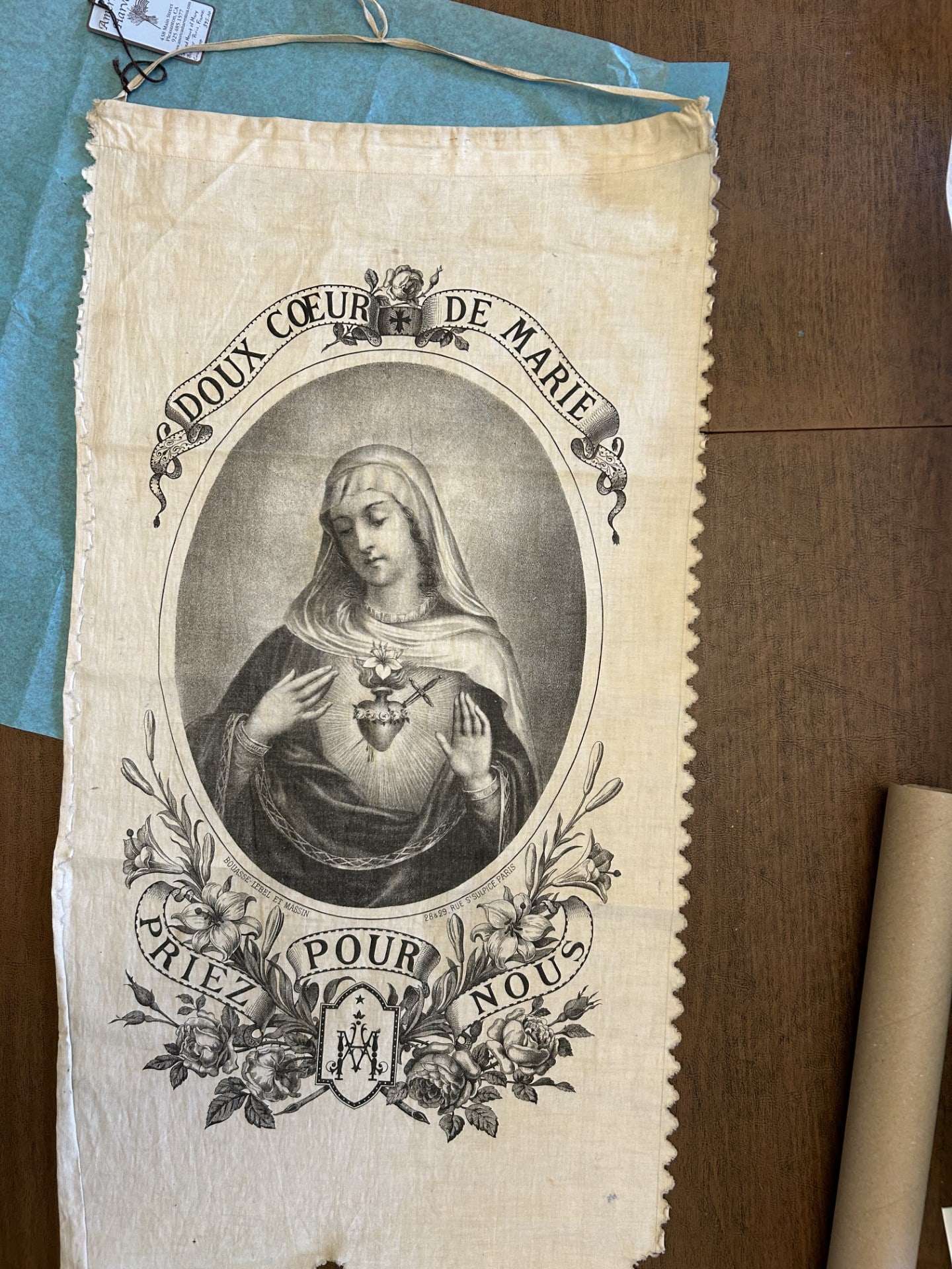 Printed on cotton cloth by Bouasse-Lebel et Massin; 28&29 Rue S'Sulpice, Paris. While the banner itself has no date on it, the item is listed in a 1901 catalog as "lithograph on fabric" (lithographie sur letoffe).