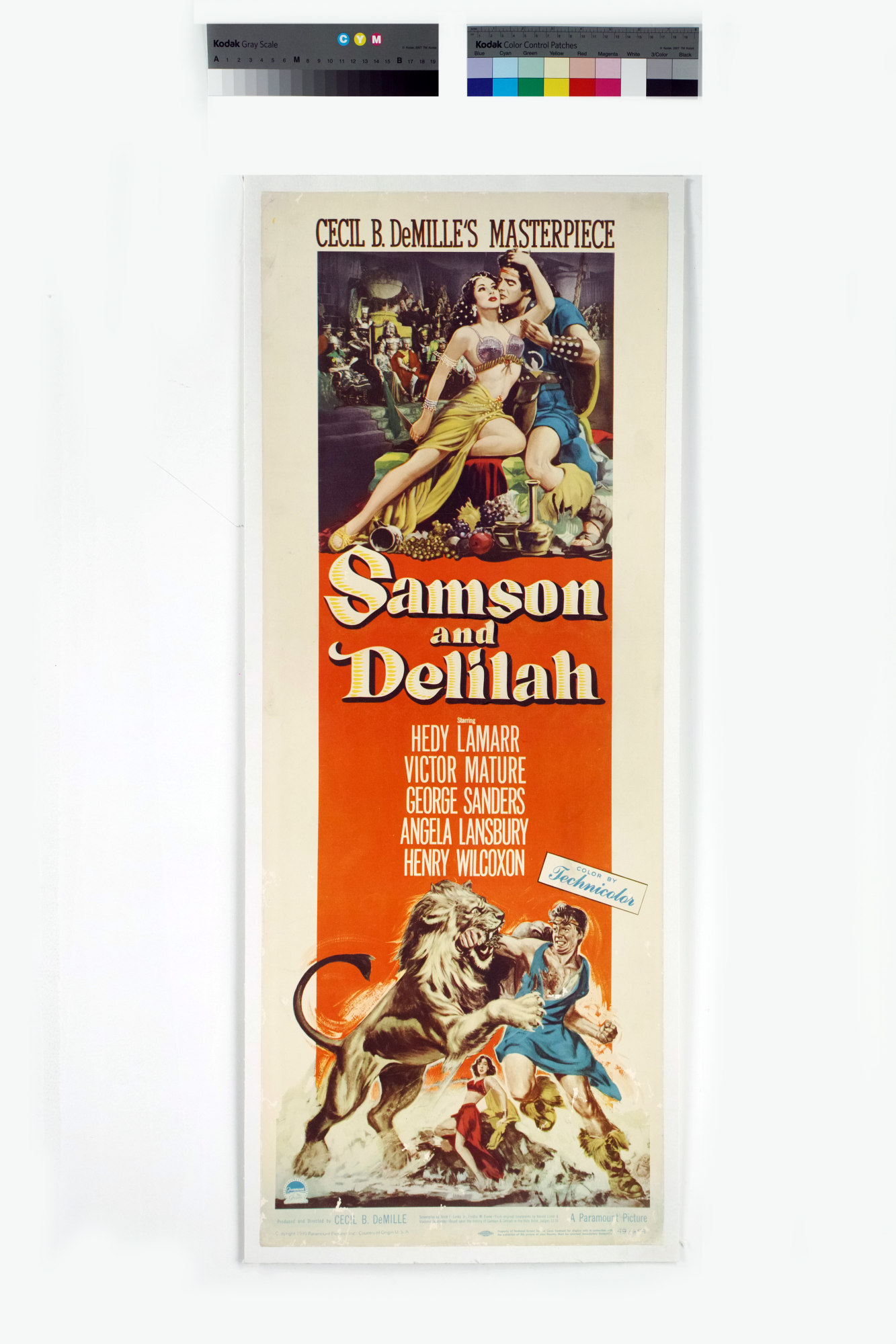The Blackfriars collection holds two iconic posters for Cecil B. DeMille’s 1949 Samson and Delilah which embody the allure of the film with its promise of sex (or at least sensuality) and violence. The star-studded cast included Hedy Lamarr as Delilah, Victor Mature as Samson, George Sanders as the Saran of Gaza, and Angela Landsbury as Samson’s fiancé Semadar. Lamarr, at the time one of the biggest stars in Hollywood, was a natural choice for Delilah, but Mature made for an odd Samson as he was terrified by virtually every element of the production from the live animals to the swords.