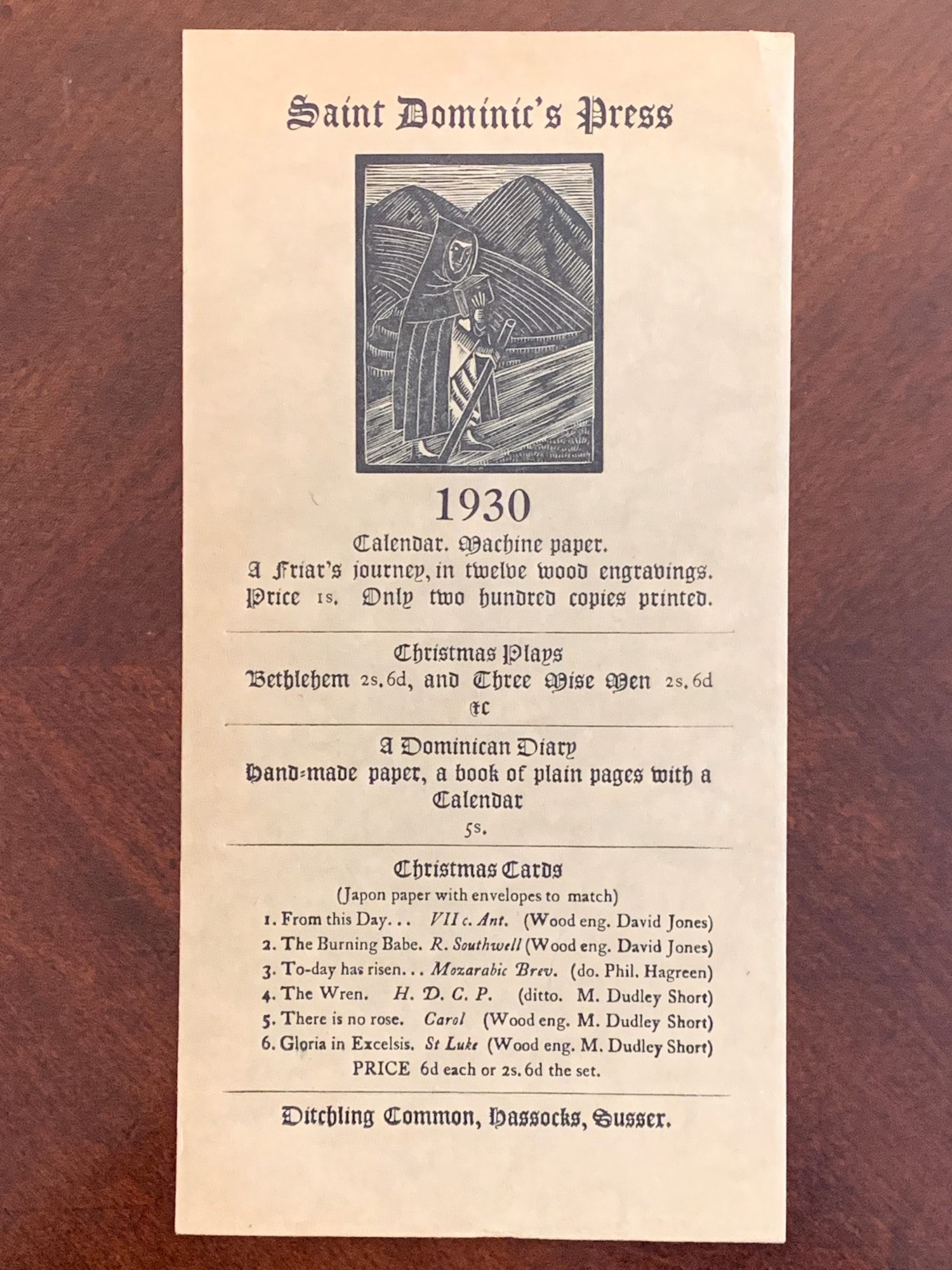 Broadside announcement for Saint Dominic's Press 1930, with woodblock by Short.