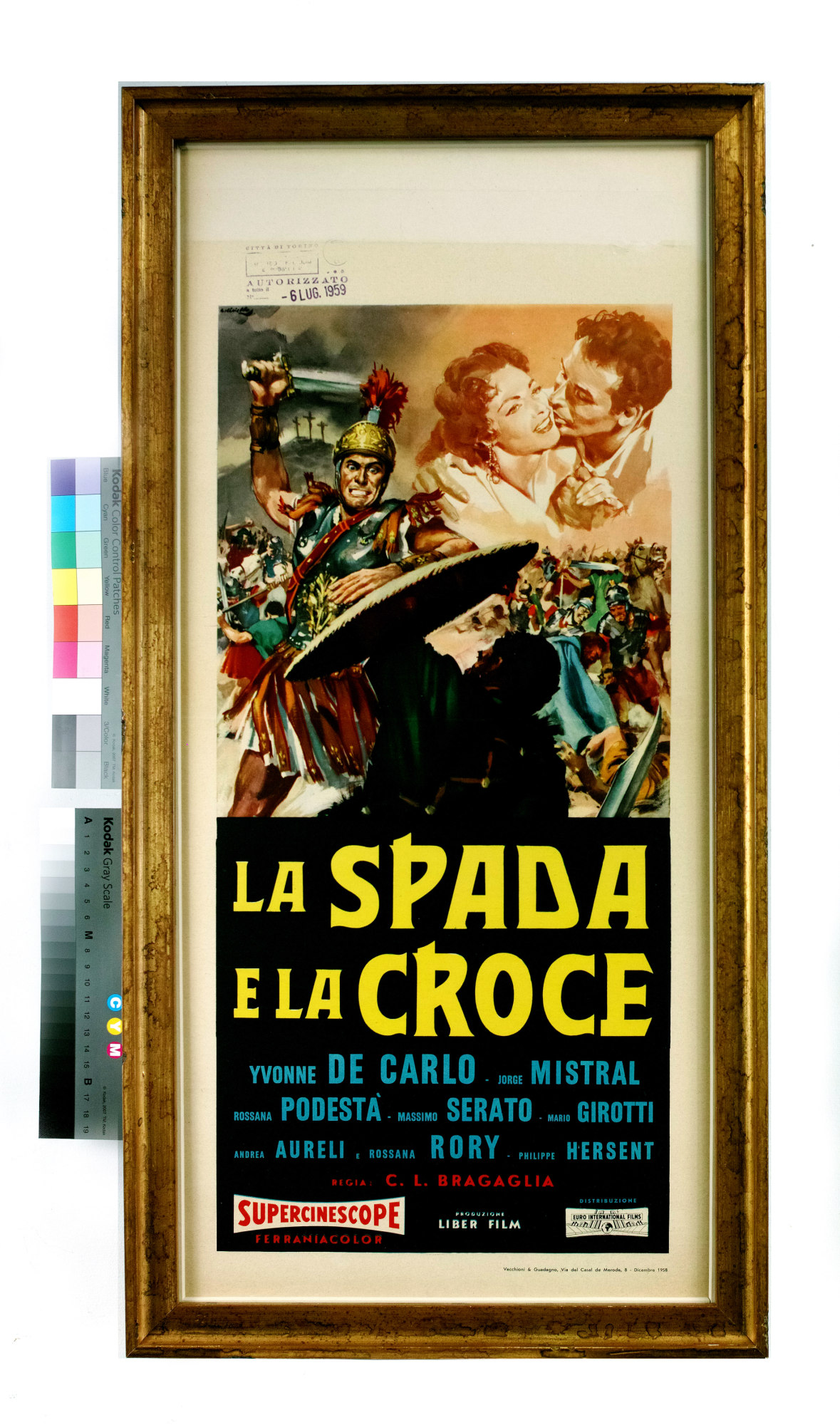 A poster for the 1958 Italian epic, The Sword and the Cross, directed by Carlo Ludovico Bragaglia, starring Yvonne de Carlo as Mary Magdalene. The film was released in the US in 1960 under the title Mary Magdalene. De Carlo also starred as Moses’ wife Sephora in Cecil B. DeMille’s The Ten Commandments. The film is a classic of the genre, set against the backdrop of the Roman occupation of Israel and taking minor New Testament characters like Mary Magdalene and Barabbas and building a feature-length film around them.
