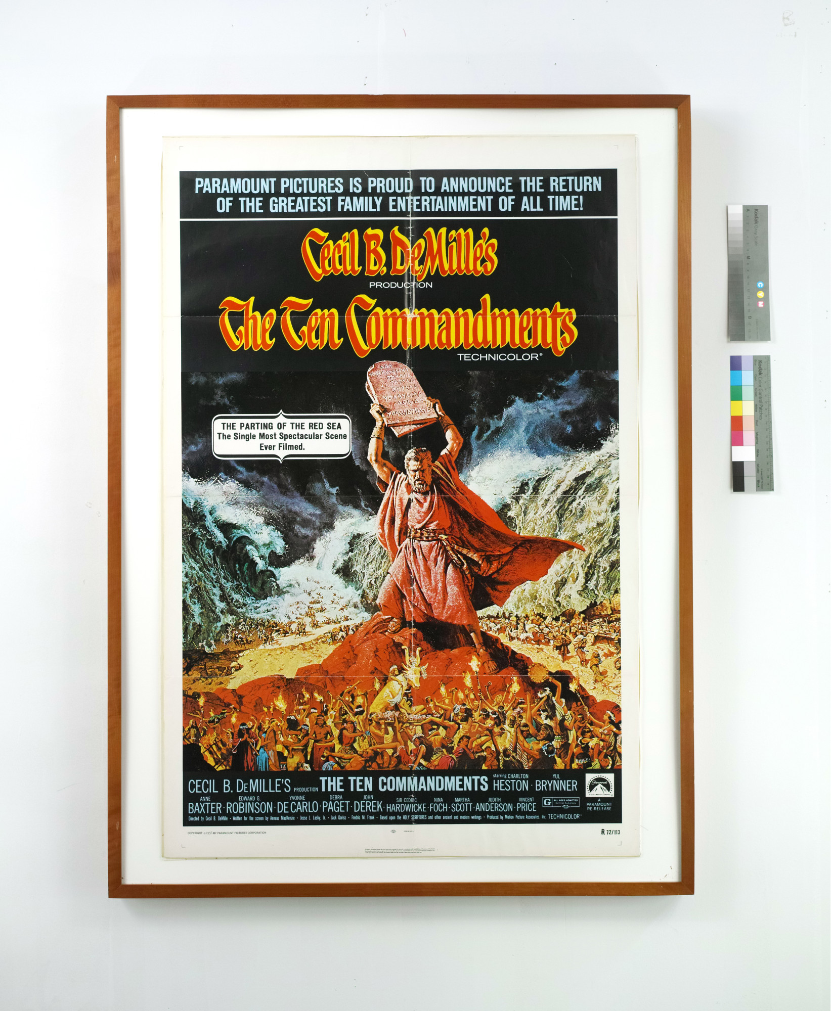 National Screen Service Corp., R 72/13. This poster is for the rerelease of the 1956 Paramount production. The image, showing Moses about to hurl the stone tablets in order to destroy the golden calf, was painted by legendary commercial artist Frank McCarthy.