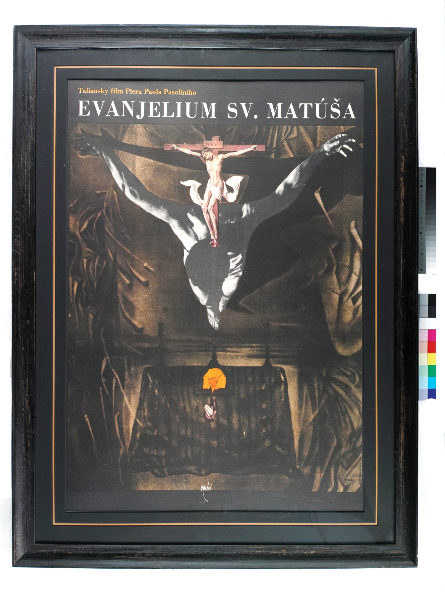 A surrealist painter, Vyletal based this image on "Christ of St. John of the Cross," by Salvador Dali, with whom he developed a friendship during his lifetime. His major influences were surrealism and paintings by North Renaissance old masters. He was married to the artist and award winning poster designer Olga Poláčková-Vyleťalová. The poster brings together not only the influences of surrealists like Dail, but also Vyletal's interest in the masters of Northern Renaissance. The face of the woman superimposed upon the altarcloth in the lower third of the poster is reminiscent of one of the women in the center panel of the Crucifixion Tryptich (1443-1445, Brussels) by Rogier van der Weyden.