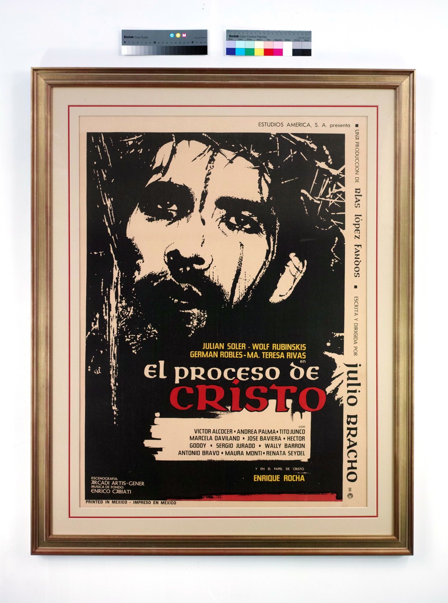 This Mexican poster for Julio Bracho’s 1966 film, The Trial of Christ, centers on the tortured, thorn-crowned face of Jesus leading up to his crucifixion. Bracho’s feature film recounts the trial and last hours of Jesus’ life from the point of view of Peter and Pontius Pilate. It starred Enrique Rocha as Jesus, Víctor Alcoceras Peter, and Julian Soler as Pontius Pilate. It is also interesting to note the similarities between this film’s poster and star and those of, for example, The Gospel According to St. Matthew and Jesus of Montreal.