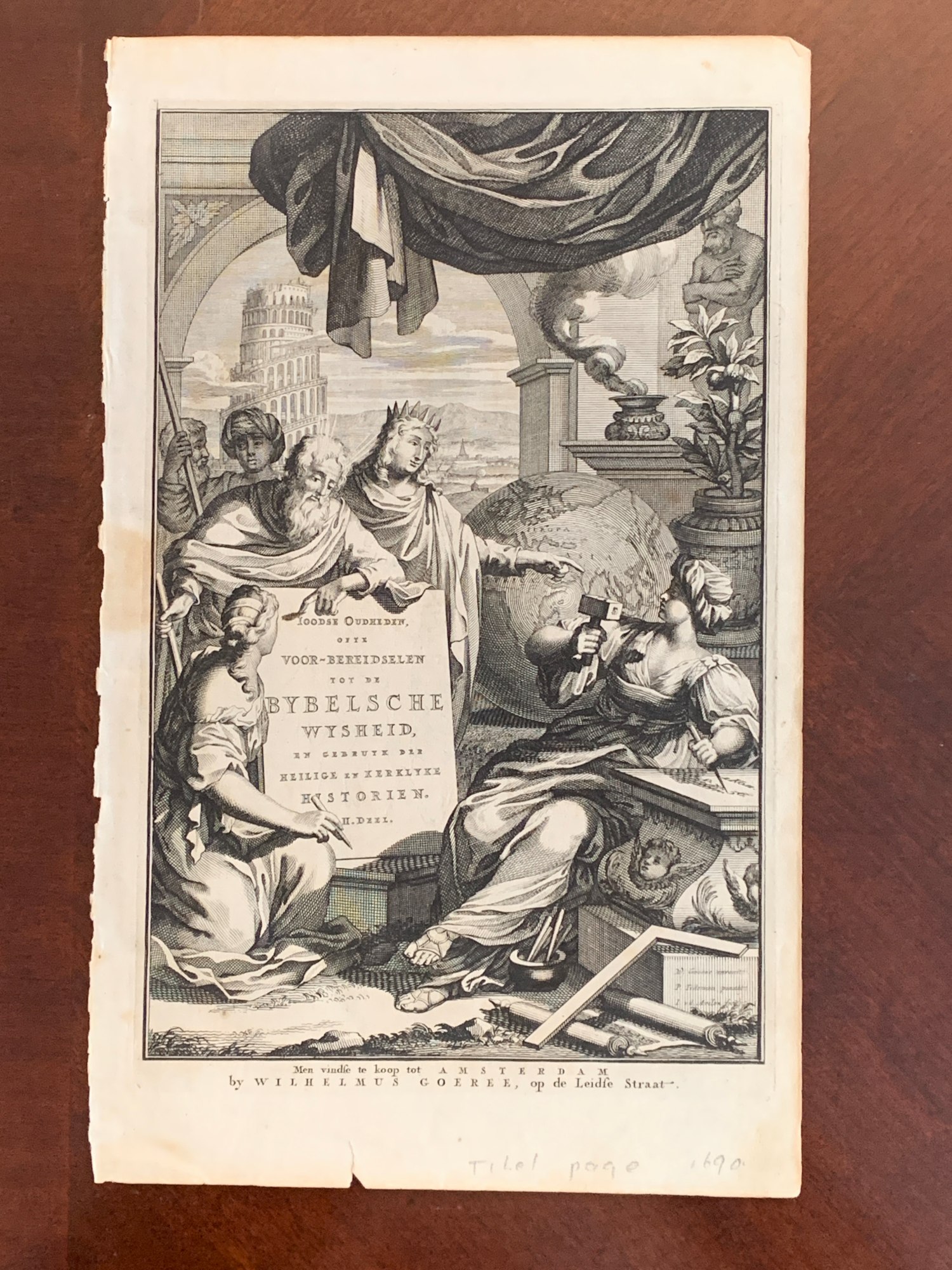 Title page from the work of the same name by Wilhelmus Goeree. Notation in pencil in lower right: "title page, 1690" From online description: illustrated monograph on Biblical history with numerous engravings, throwing light on the 17th-century attempts at reconstructing the Biblical history and bringing it up to date with the latest scientific discoveries. The illustrations include many plates with archaeological objects related to Biblical history,