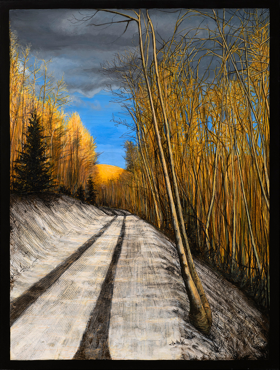 Mixed media on wood panel including charcoal, oil, pencil, and text from the book “The Blue Cliff Record”.