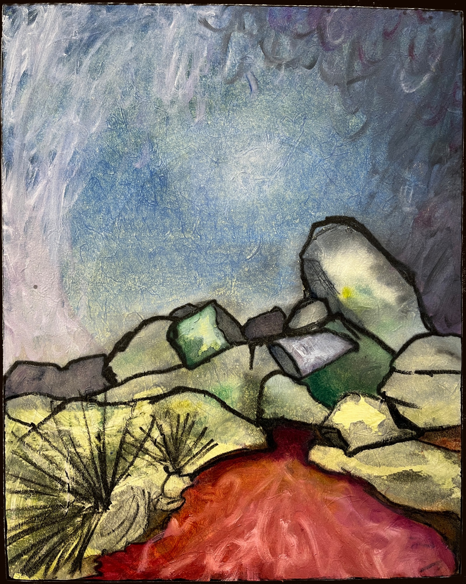 Mixed media on wood panel, including encaustic monotype, charcoal, oil and oil pastel