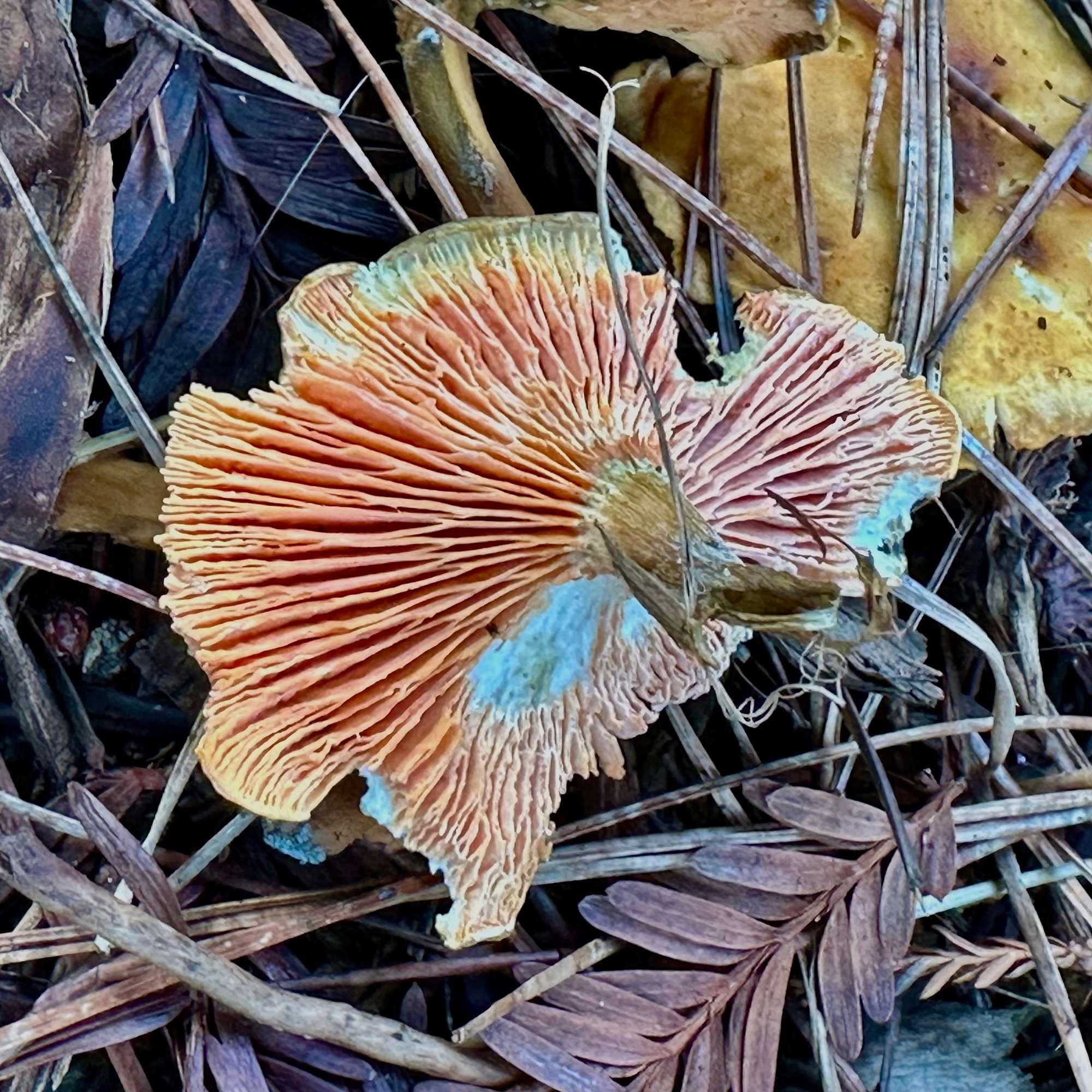 This luxuriously soft merino wool scarf is printed on both sides with a pattern created from a photograph of a mushroom on a forest floor in Northern California. The mushroom's colorful gills define rosettes that surround radiating clusters of fallen twigs. Bands of dark gold leaves connect the rosettes in quadrangular tessellation.