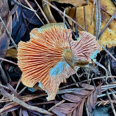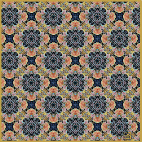 This luxurious scarf is printed on both sides with a pattern created from a photograph of a mushroom on a forest floor in Northern California. The mushroom's colorful gills define rosettes that surround radiating clusters of fallen twigs. Bands of dark gold leaves connect the rosettes in quadrangular tessellation. This is a limited edition of 25 scarves.