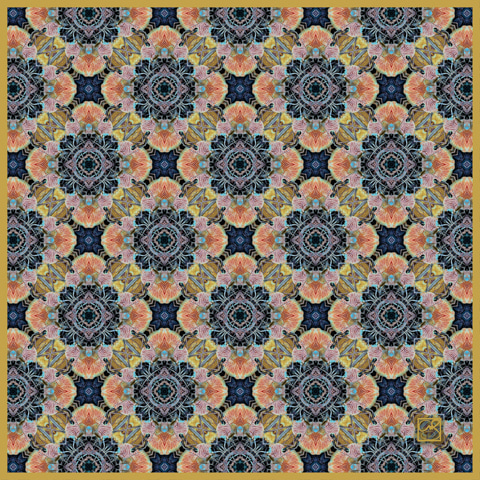 This silk pocket square is printed on both sides with a pattern created from a photograph of a mushroom on a forest floor in Northern California. The mushroom's colorful gills define rosettes that surround radiating clusters of fallen twigs. Bands of dark gold leaves connect the rosettes in quadrangular tessellation. This is a limited edition of 25 pocket squares.