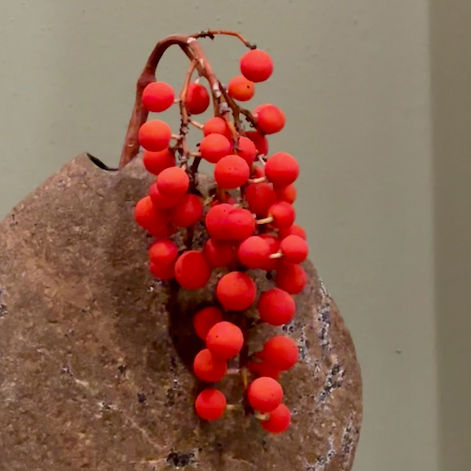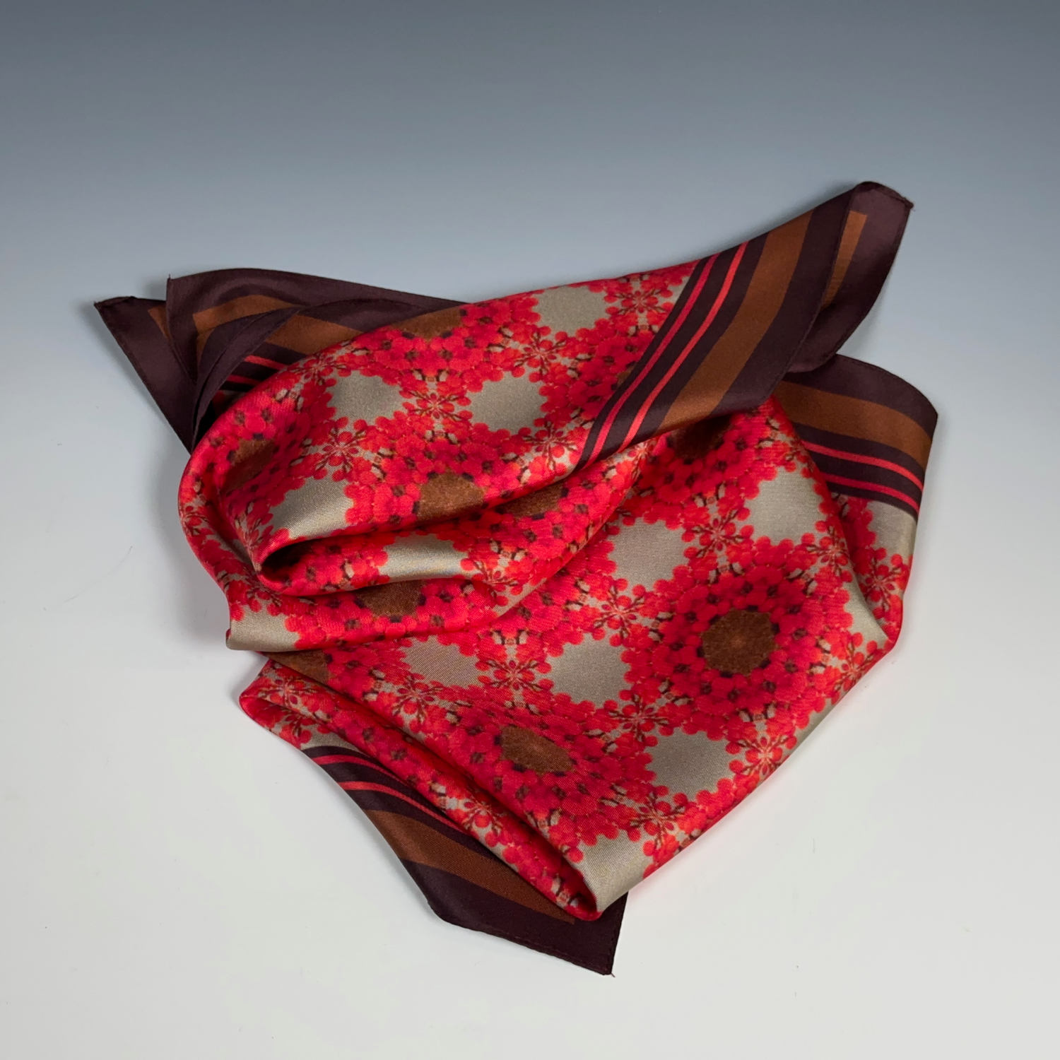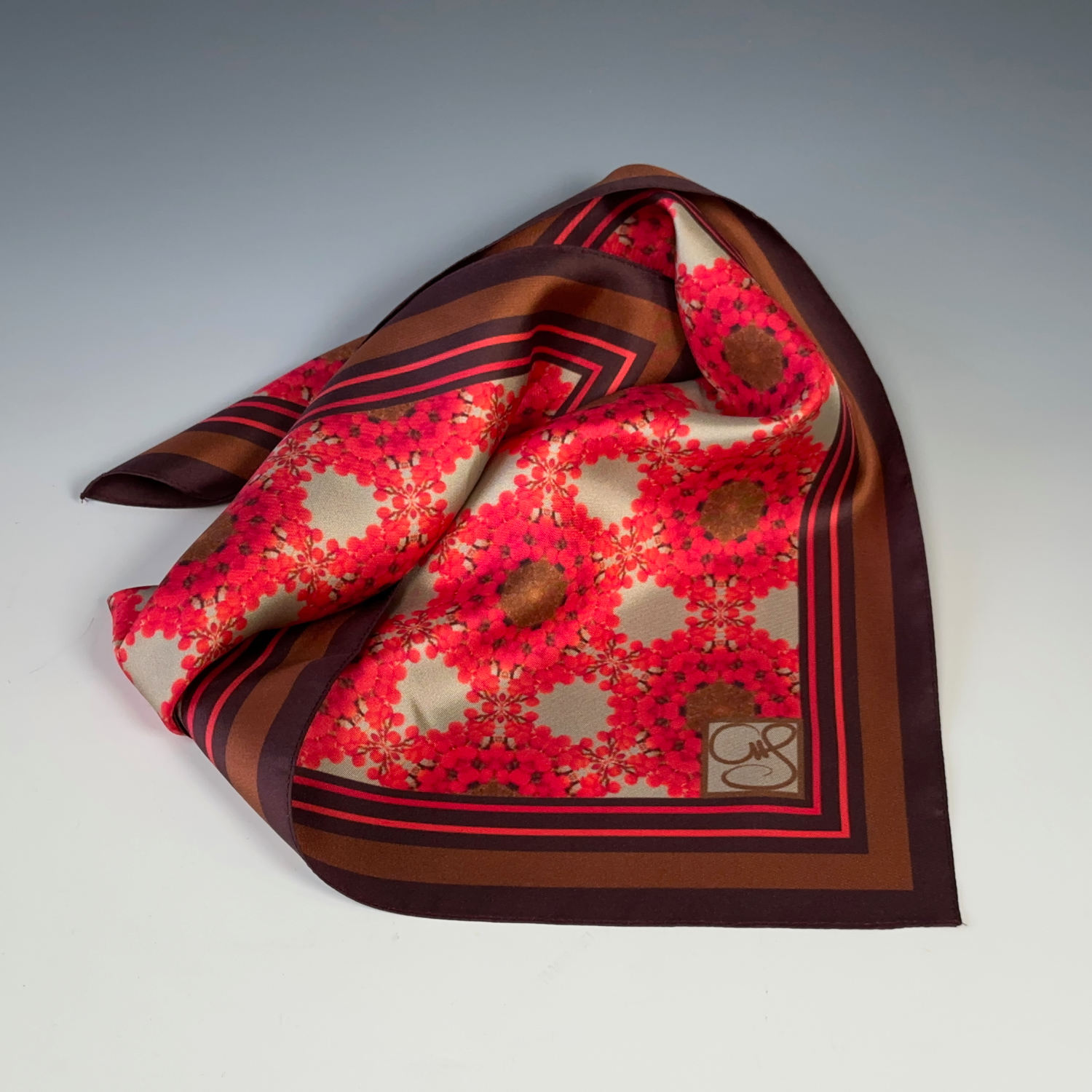 This silk scarf is printed on both sides with a pattern created from a photograph of red berries in a stone vase. The intense red berries form rosettes, which are grounded by the grays and by the brown tones of the stone vase. This is a limited edition of 25 scarves.
