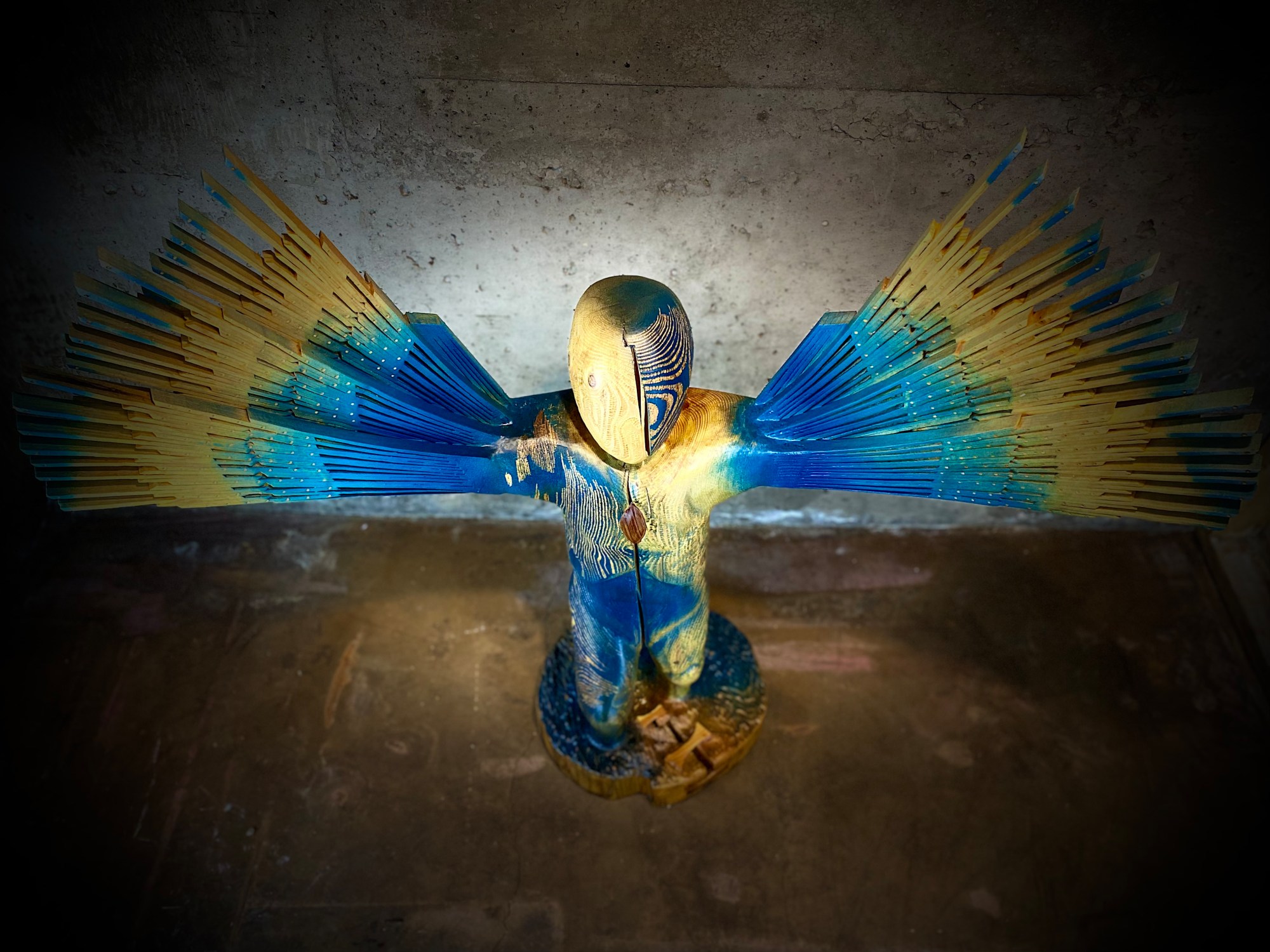 Measuring in at four feet tall with a four foot arm/wingspan, this sculpture is a portrayal of celebration and accomplishment…which seems all too fitting as it has been nearly a year in the making. The main body of the sculpture is carved from a solid piece of Douglas fur, while the arms/wings continue with my “branches” theme. Every single seam of wood grain in the body was hand-tooled with added texture. The sculpture was finished with spray paint, epoxy, and eight coats of a heavy duty marine varnish.