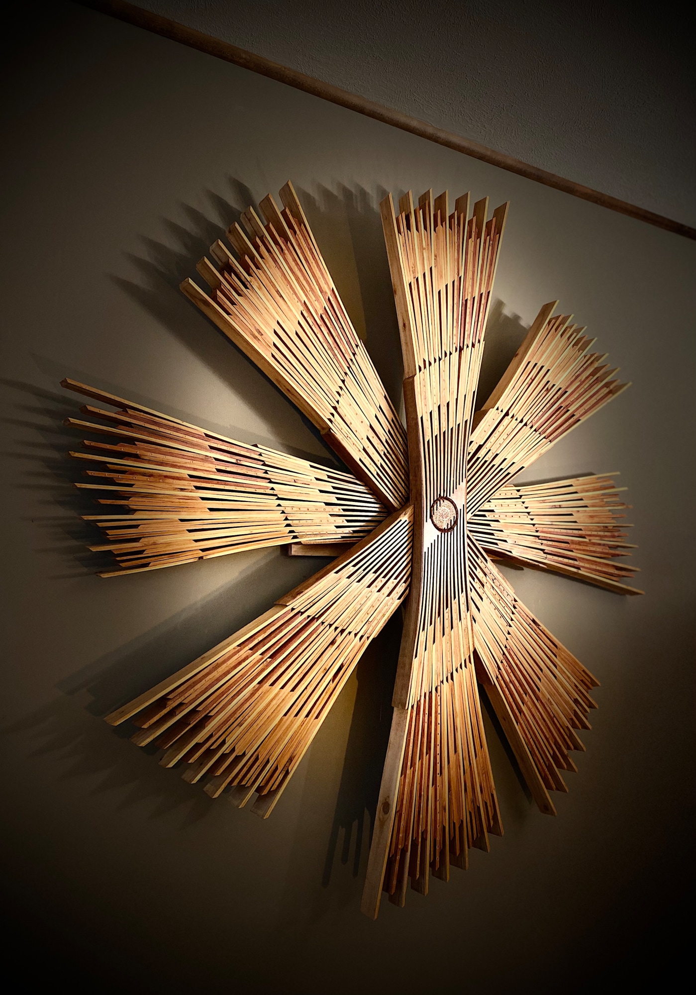An abstract rendition of rays of the sun. This dimensional wall piece casts an array of unique shadows depending on the light.