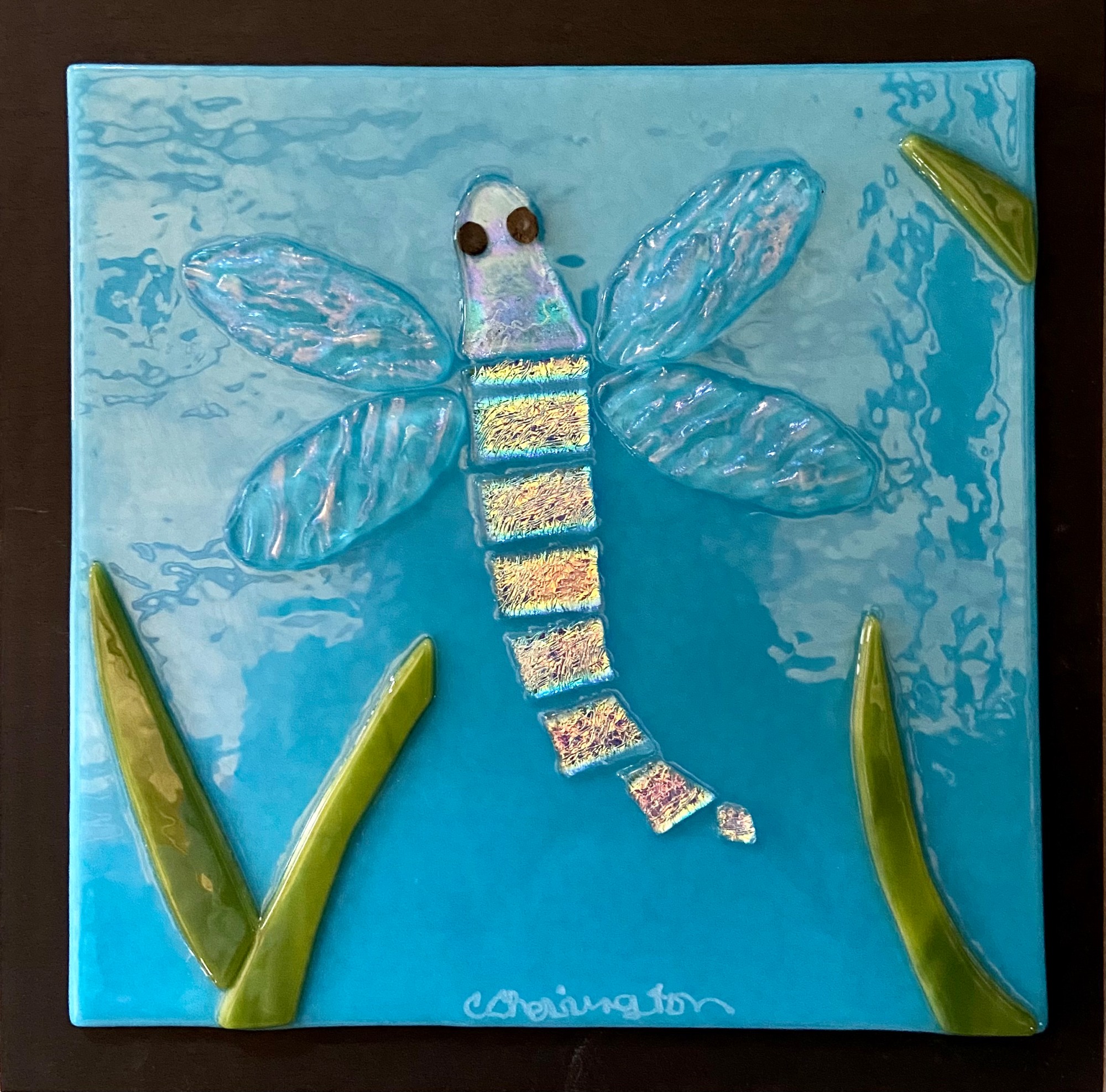 On a field of blue is fused a dichroic dragonfly with clear irid wings. Mounted on a painted black board and ready to hang.