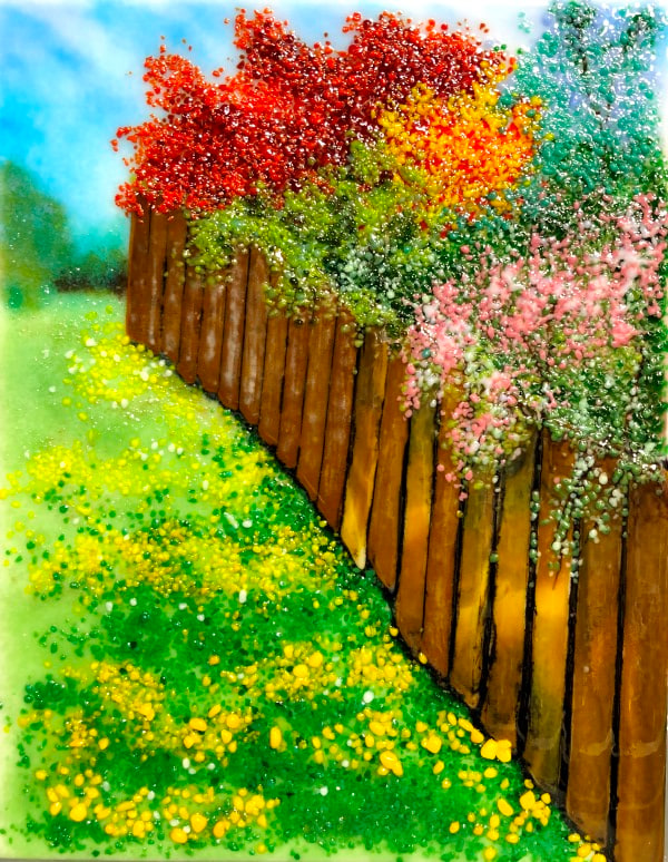 Created with mostly crushed glass bits (frit) this piece shows the detail of spring foliage from the other side of the fence. Layered and fired four times to create depth. Mounted on wood panel with hanging wire.