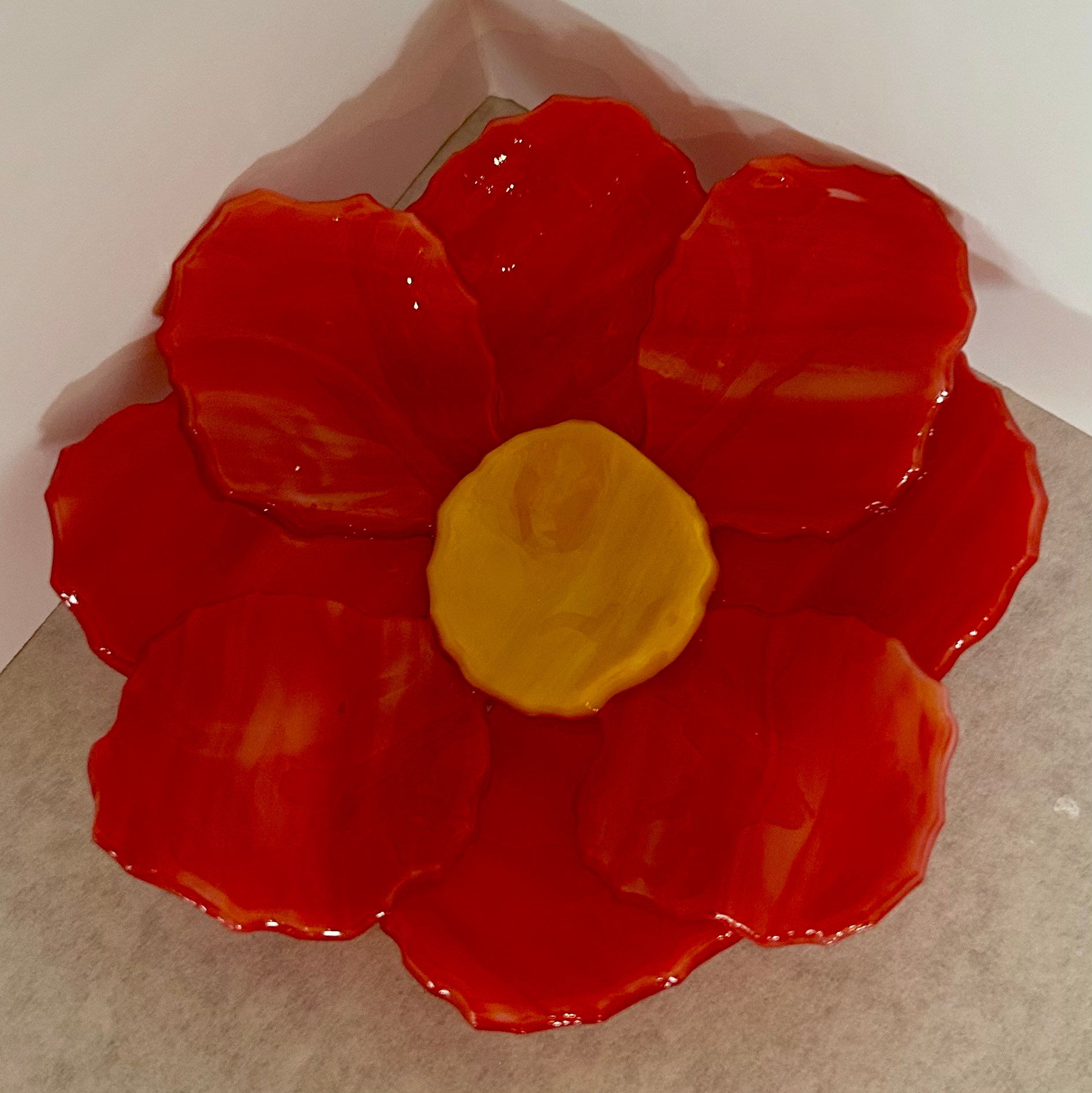 Artistry and functionality combine in this stunning bowl that is more than just a decorative piece. Each Fused Glass Flower Bowl is a unique work of art. Whether filled with potpourri, or left empty as a striking decorative element, it will add a beautiful touch of nature to any space. This flower dish was made using red swirl opaque glass with a yellow center.