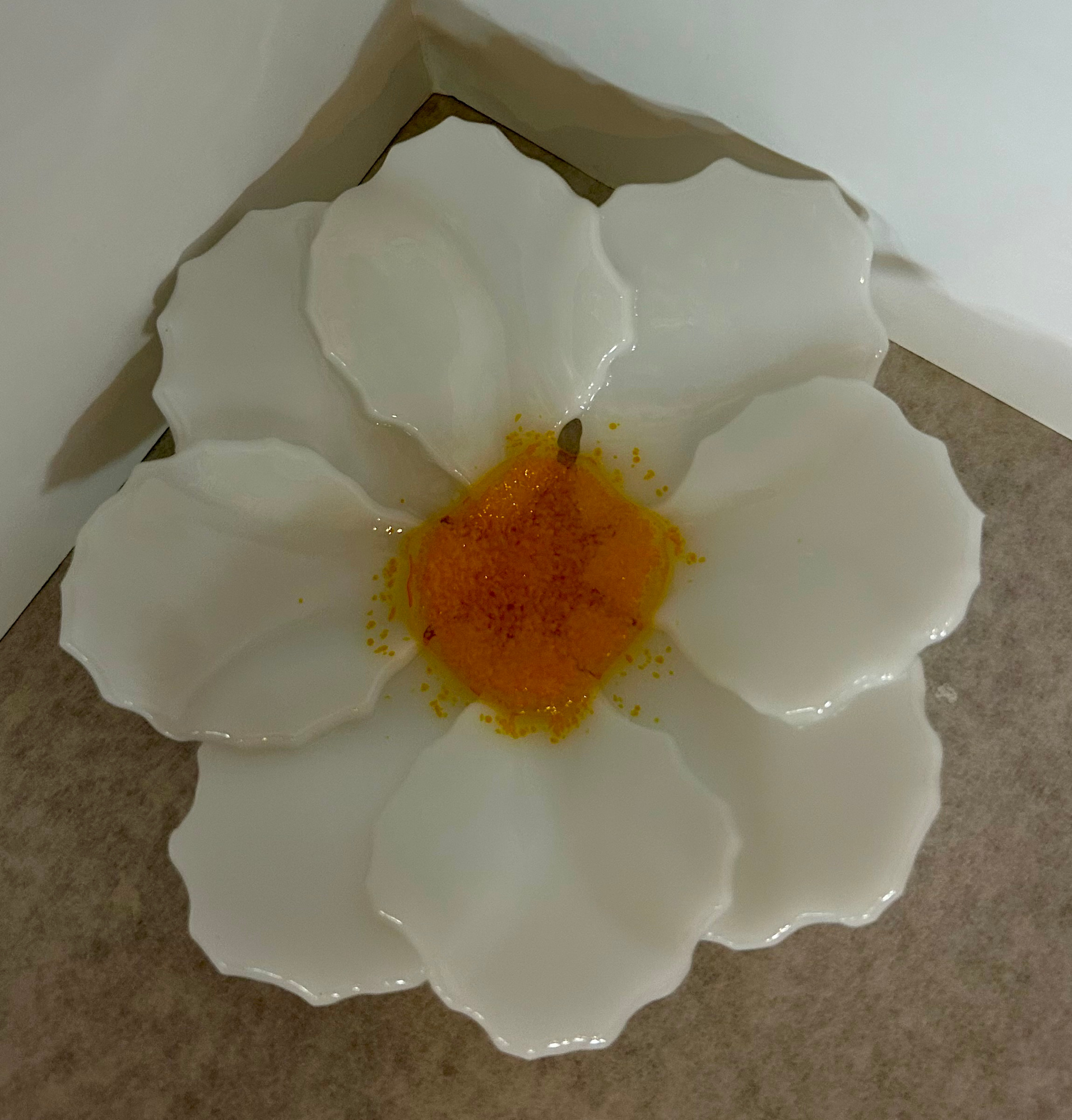 Artistry and functionality combine in this stunning bowl that is more than just a decorative piece. Each Fused Glass Flower Bowl is a unique work of art. Whether filled with potpourri, or left empty as a striking decorative element, it will add a beautiful touch of nature to any space. This flower dish was made using white opaque glass with a yellow center.