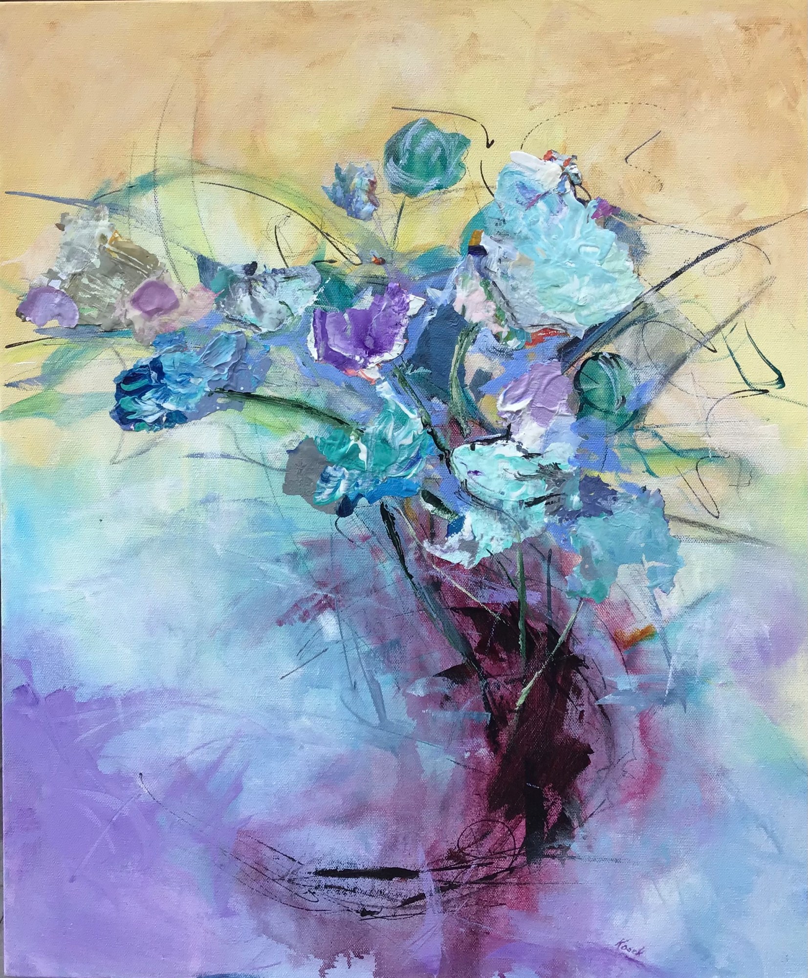The dawn of spring elicits exuberant spirits along with breezy florals. This piece uses acrylic skins as the blossoms for texture and dimension.