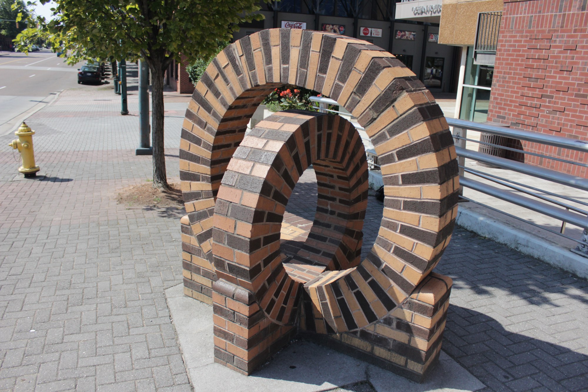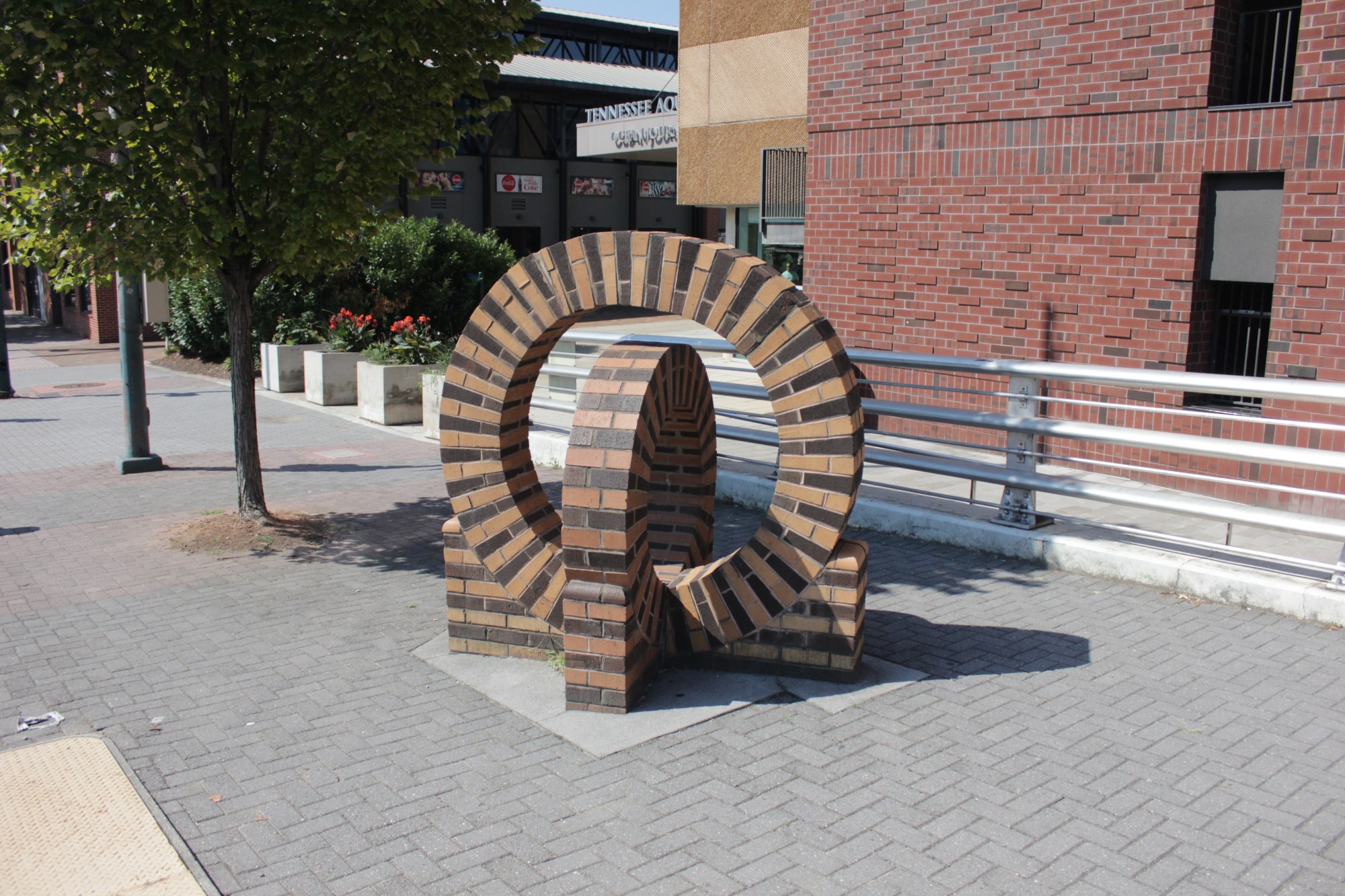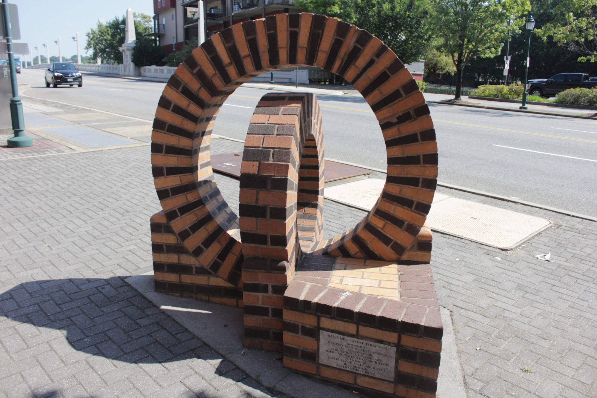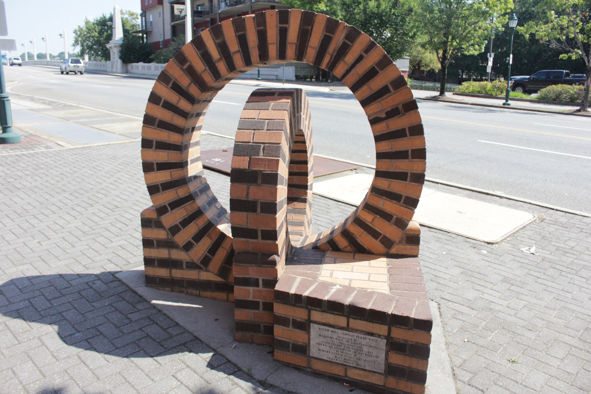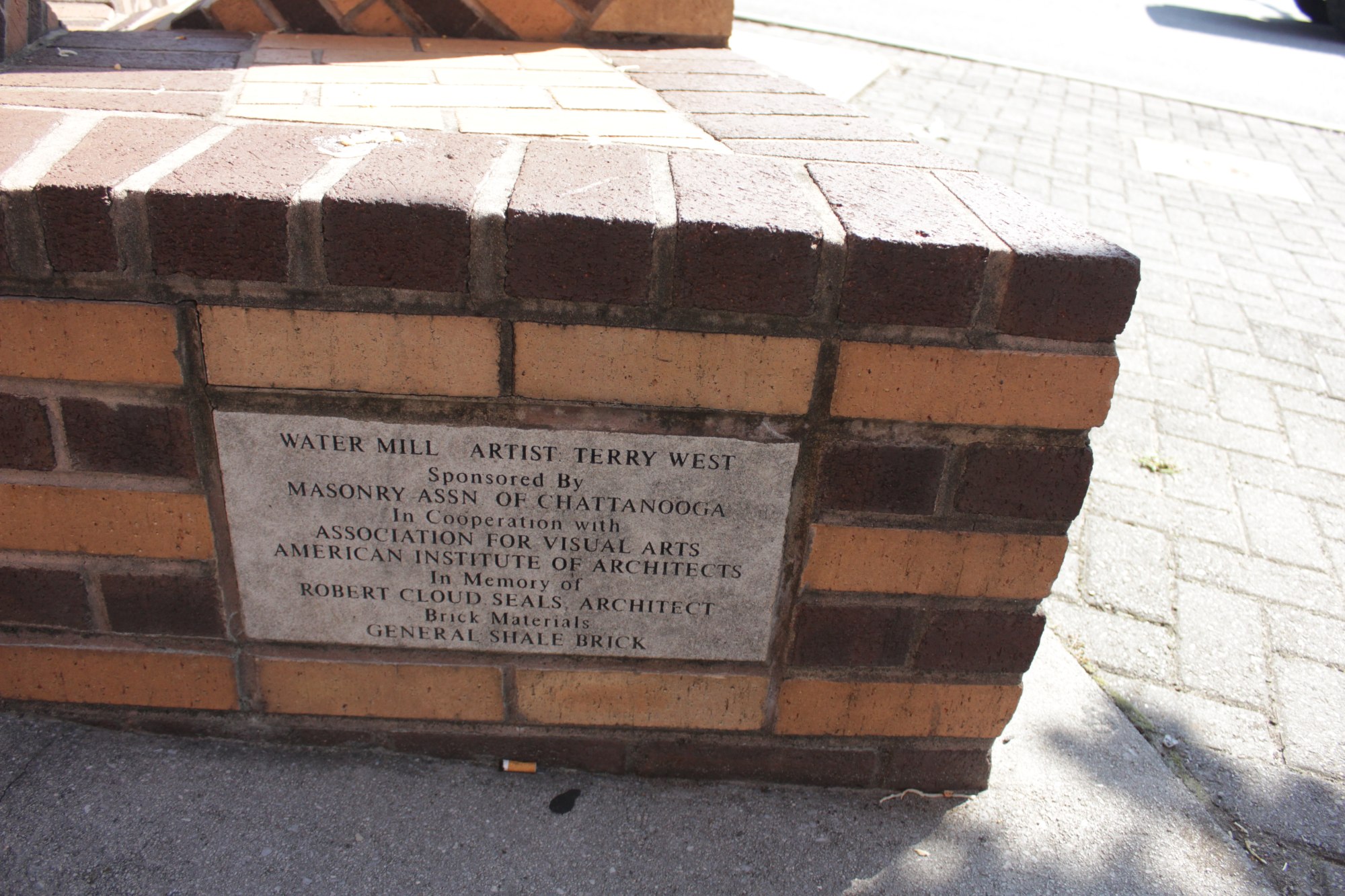 This work is one of several masonry seating elements found throughout the city created through a collaboration between the Association for Visual Arts (AVA) and the Chattanooga Masonry Association where an annual design contest was held.