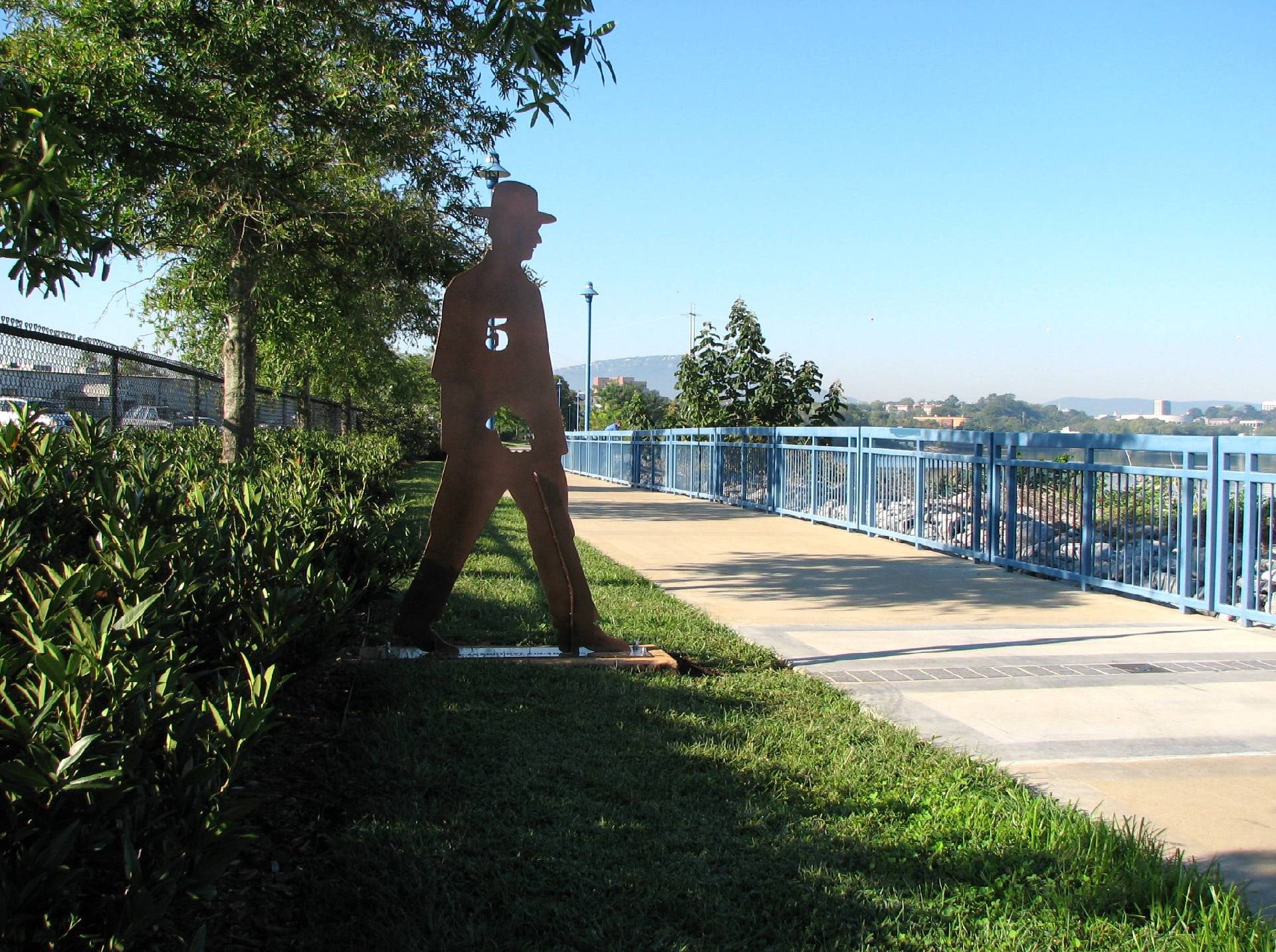 Walking Man is one in a series of nine Riverwalk mile markers by artist Jim Collins that are placed along the Tennessee River. The sculptures depict the variety of users that take advantage of this public greenway system. Each one marks a mile between the Chickamauga Dam and Ross’s Landing, offering park-goers an aesthetically pleasing and useful visual experience.
