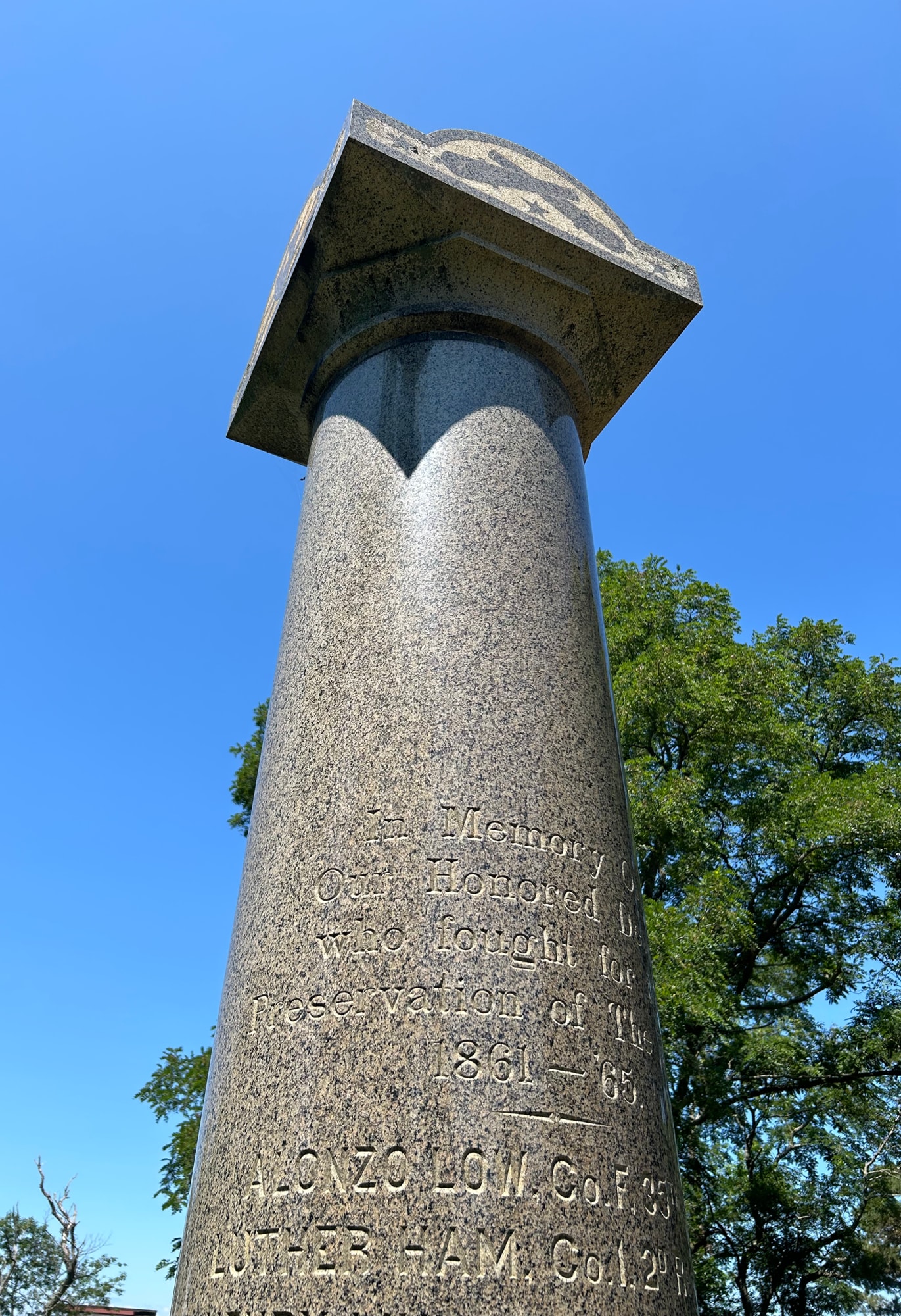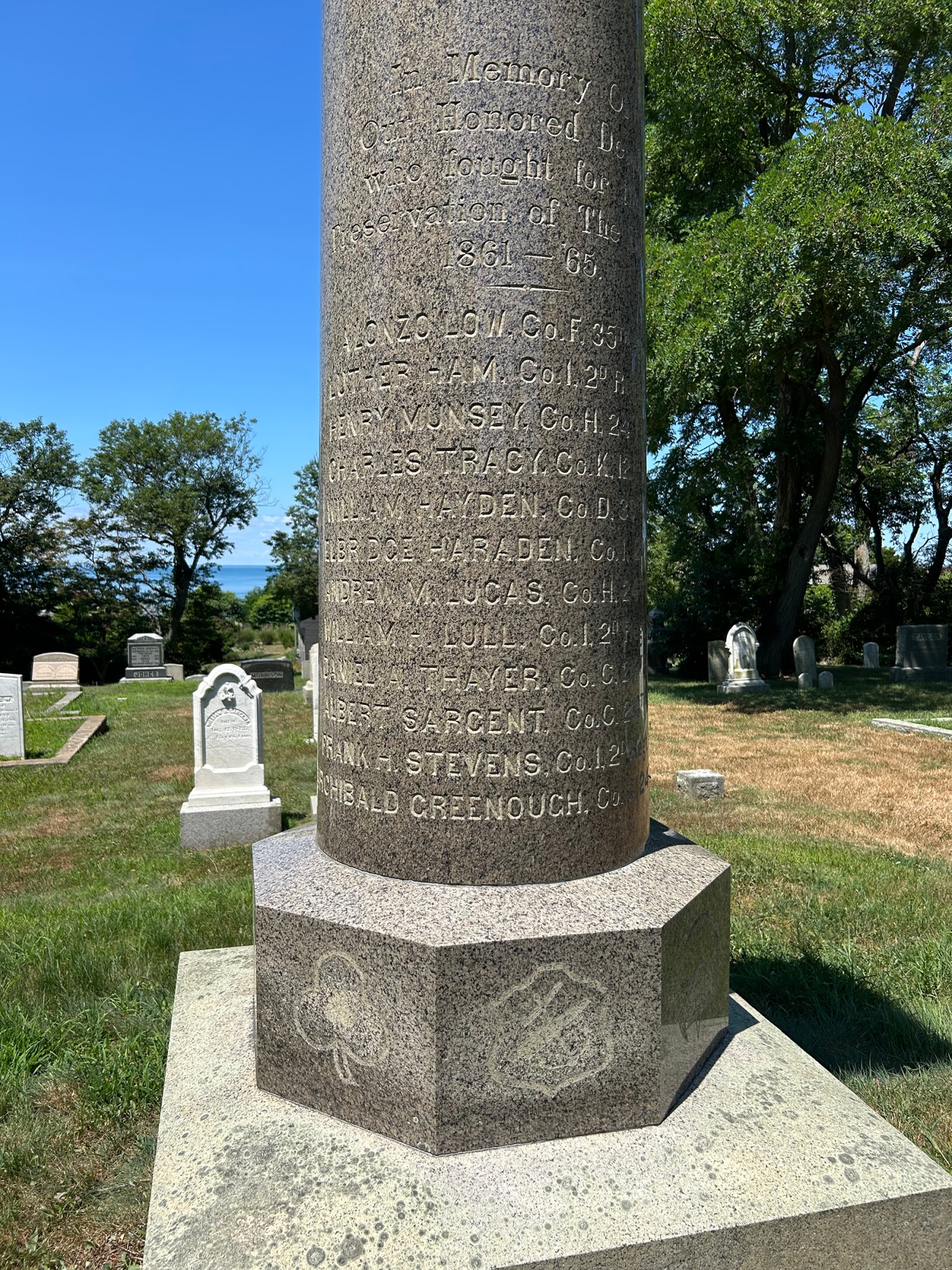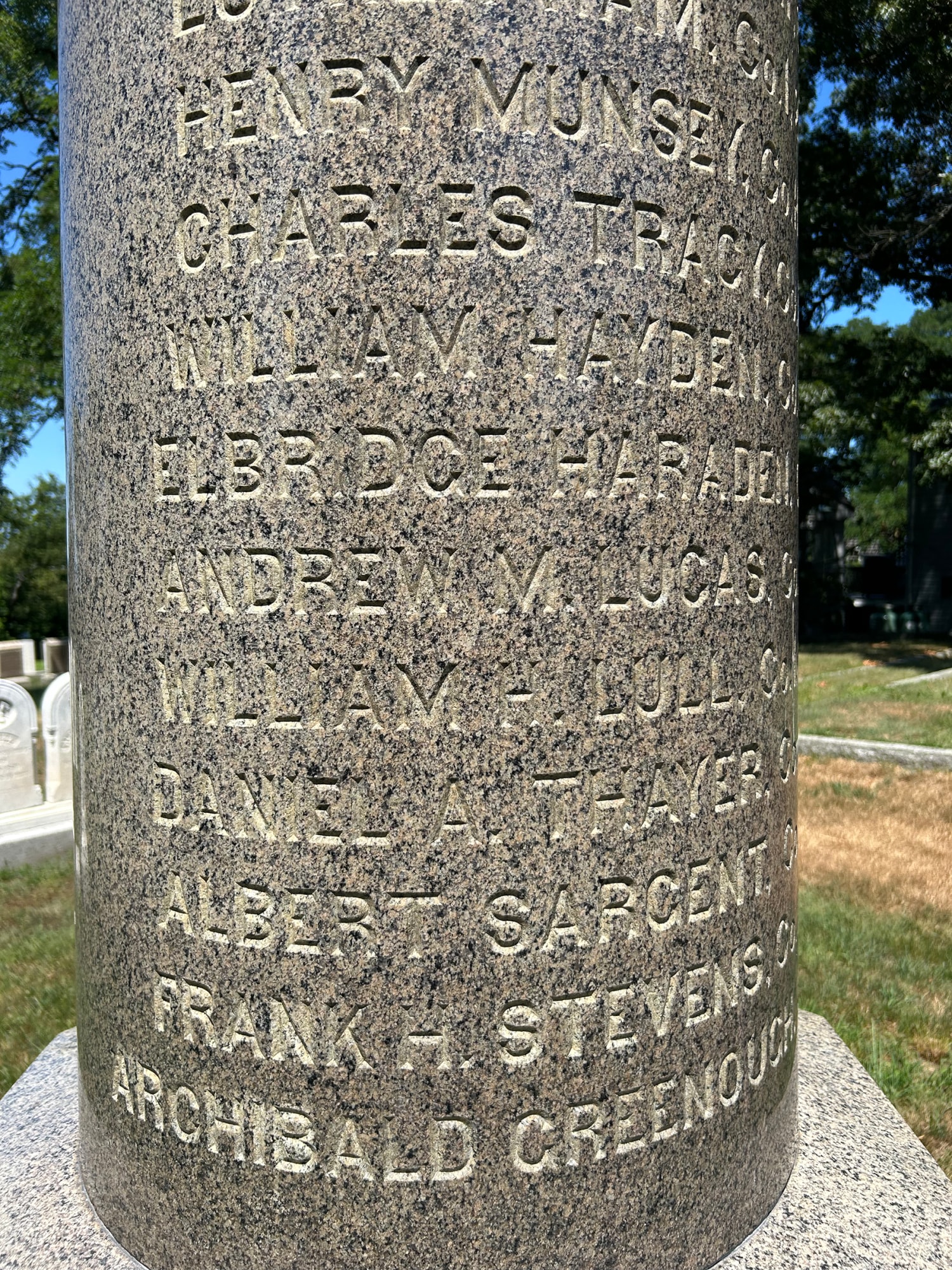 Names inscribed are: Alonzo Low, Co. F, Thirty-fifth Regiment, Luther Ham, Co. F, Second Regiment, Heavy Artillery; Henry Munsey, Co. H, Twenty-fourth Regiment, Charles Tracy, Co. K, Twelfth Regiment, William Hayden, Co. I, Second Regiment, William H. Lull, Co. I, Second Regiment, Heavy Artillery, Andrew M. Lucas, Co. H, Twenty-fourth Regiment, Daniel A. Thayer, Co. C, Twenty-fourth Regiment, Frank H. Stevens, Co. I, Second Regiment, Heavy Artillery, Archibald Greenough, Co. C., Twenty-fourth Regiment."