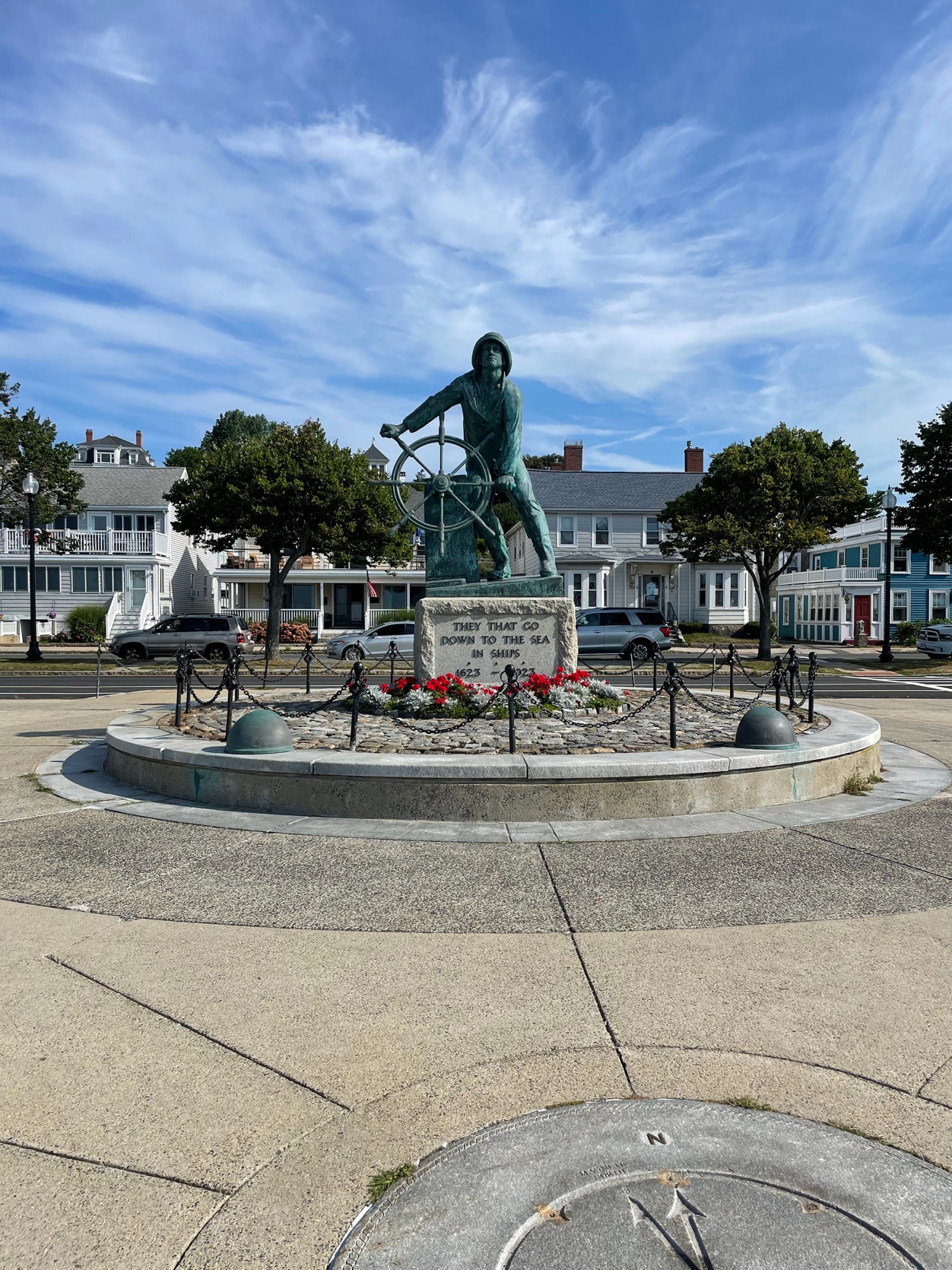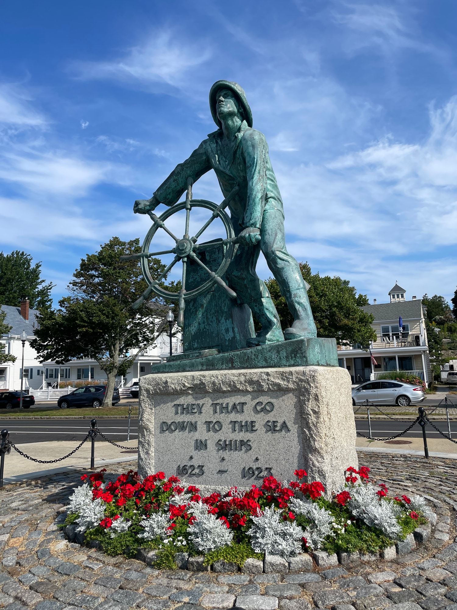 The Man at the Wheel, also known as the Fisherman's Memorial, stands as a poignant tribute to the generations of fishermen who have braved the treacherous waters of the North Atlantic from Gloucester, Massachusetts. Erected in 1925 to commemorate the town's 300th anniversary, this iconic bronze statue depicts a resolute fisherman gripping the wheel of his vessel, embodying the courage and endurance of Gloucester's maritime community. Sculpted by Leonard F. Craske, the memorial is inscribed with the solemn dedication: ""They That Go Down to the Sea in Ships,"" a line from Psalm 107, capturing the spirit of those who have dedicated their lives to the sea.