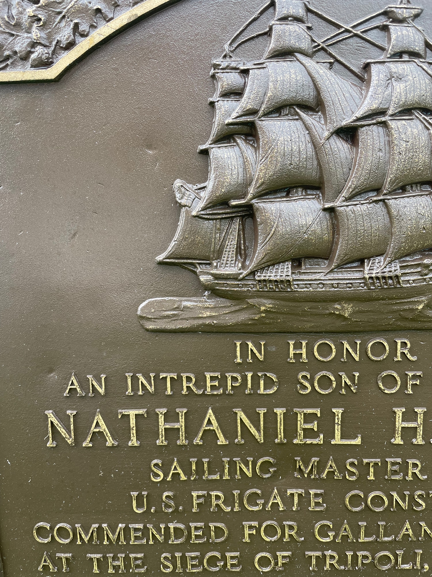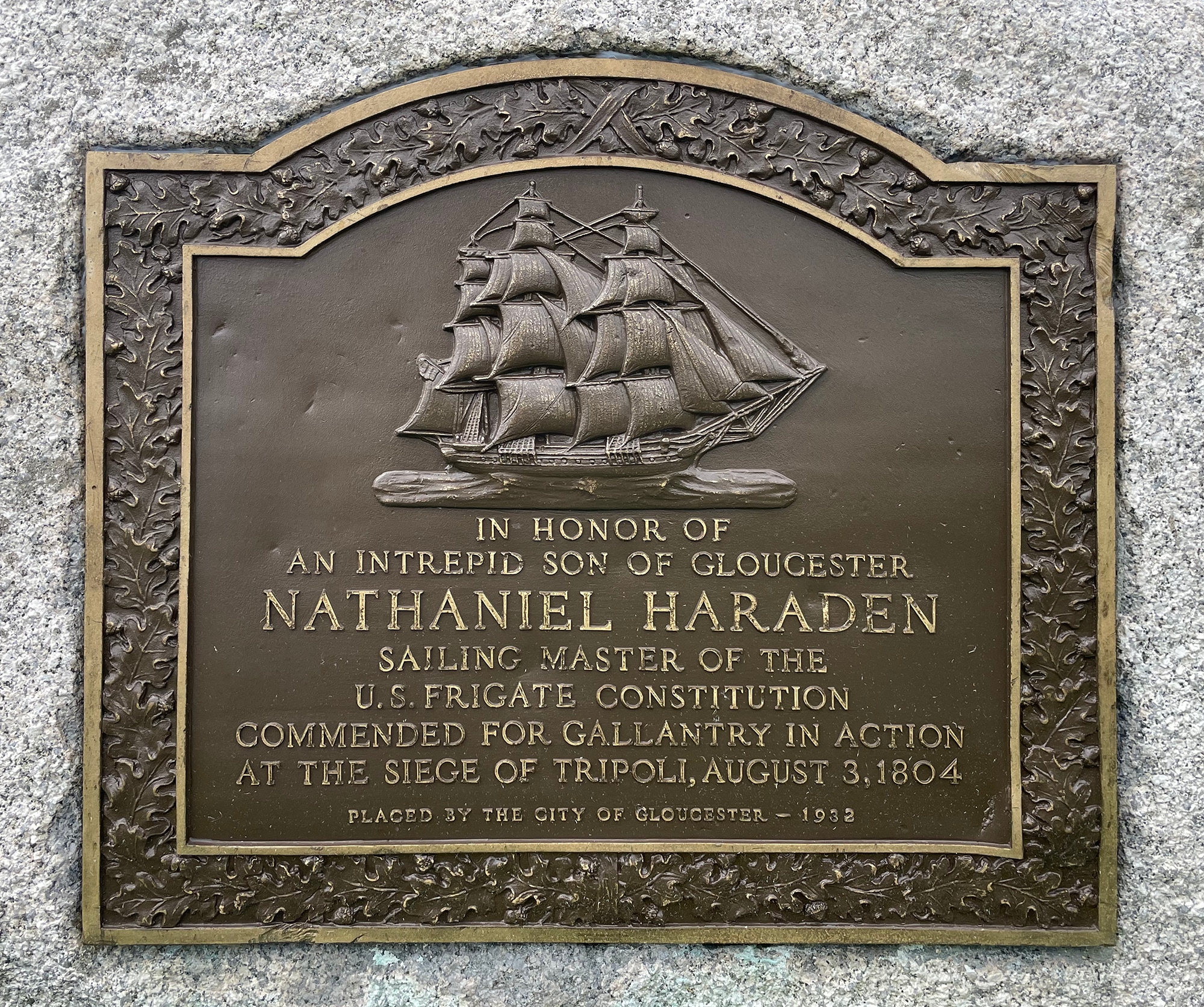 Memorial stone, dedicated 1932, in honor of “an intrepid son of Gloucester, Nathanial Haraden, Sailing Master of the U.S. Frigate Constitution. Commended for gallantry in action at the siege of Tripoli, August 3, 1804.