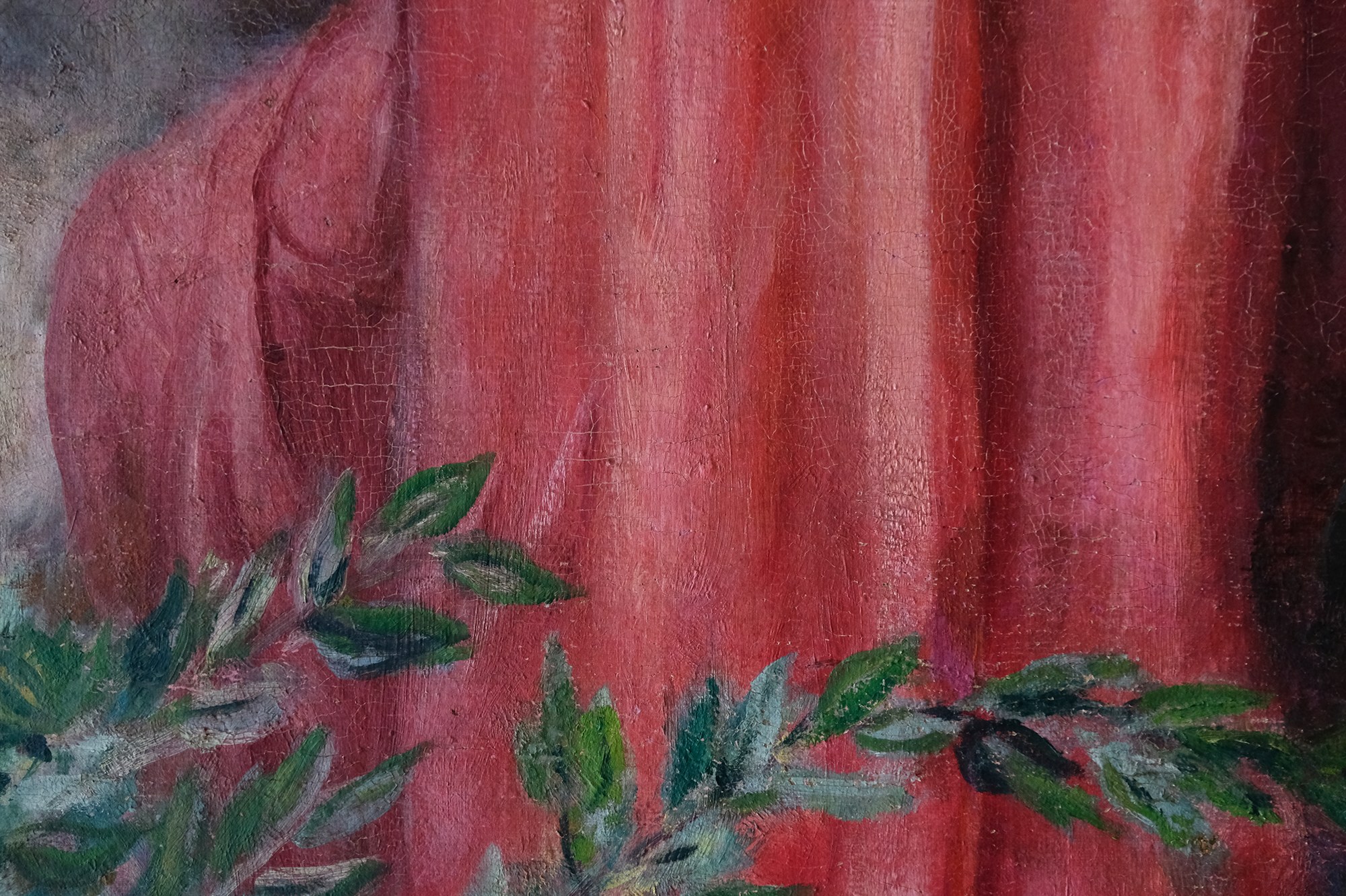 Like the Mulhaupt murals nearby, Poetry was originally painted for the Central Grammar School and was installed at the end of a long second floor corridor. Approaching it from a distance, the over life size stature of the figures emphasized the heroic and immortal subject matter. Winter’s idealistic views manifested in this educational vision of artistic inspiration. As it exists here, the Central Grammar installation was designed to be around a door.