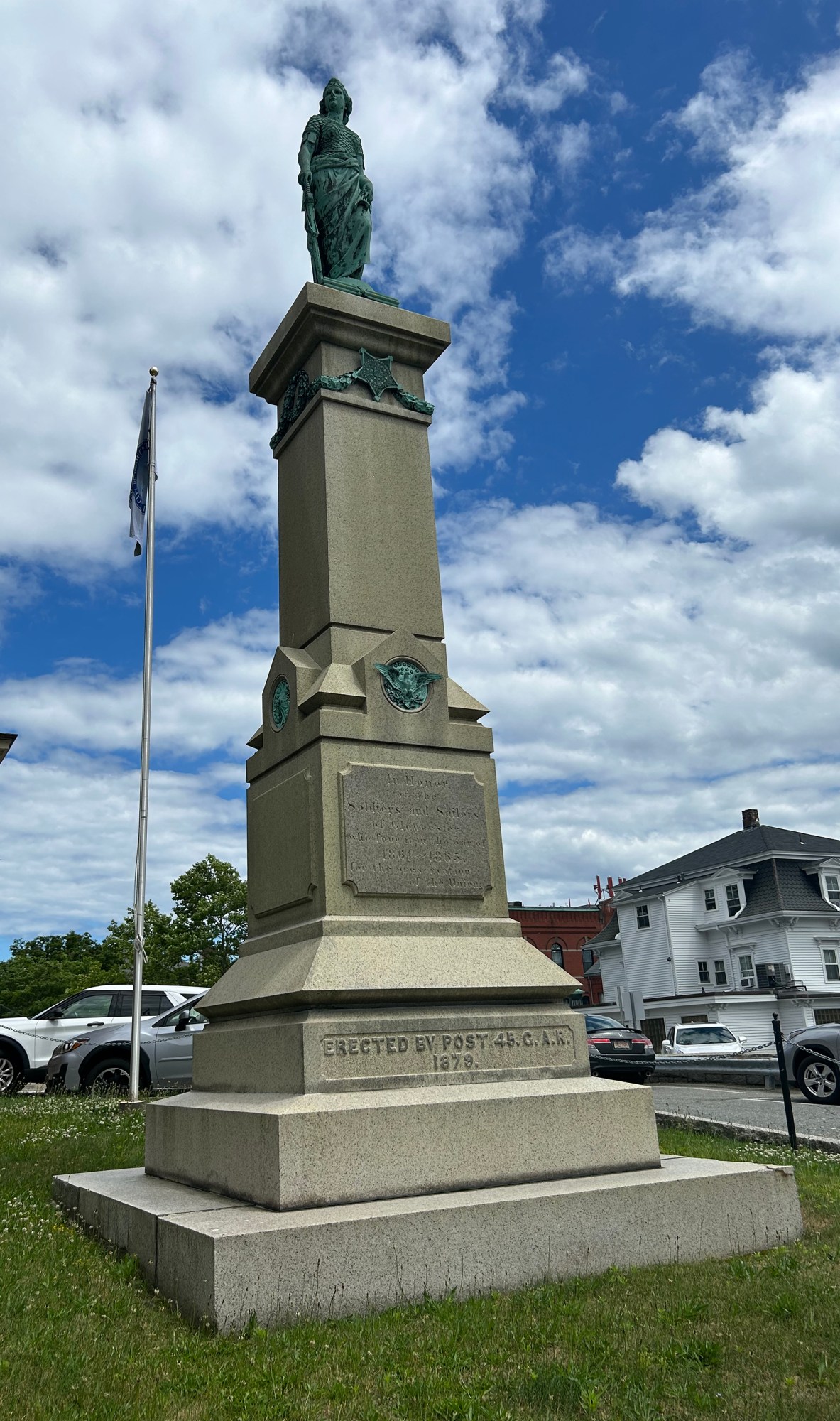"In memory of the soldiers and sailors of Gloucester who fought in the war of 1861-1865, for the preservation of the Union. Erected by Post 45, G. A. R., 1879." It features an elaborate plinth surmounted by a handsome bronze statue representing "Liberty" cast by the Ames Manufacturing Company. Rev. J.F. Levering of Watertown gave the oration during the very large dedication exercises.