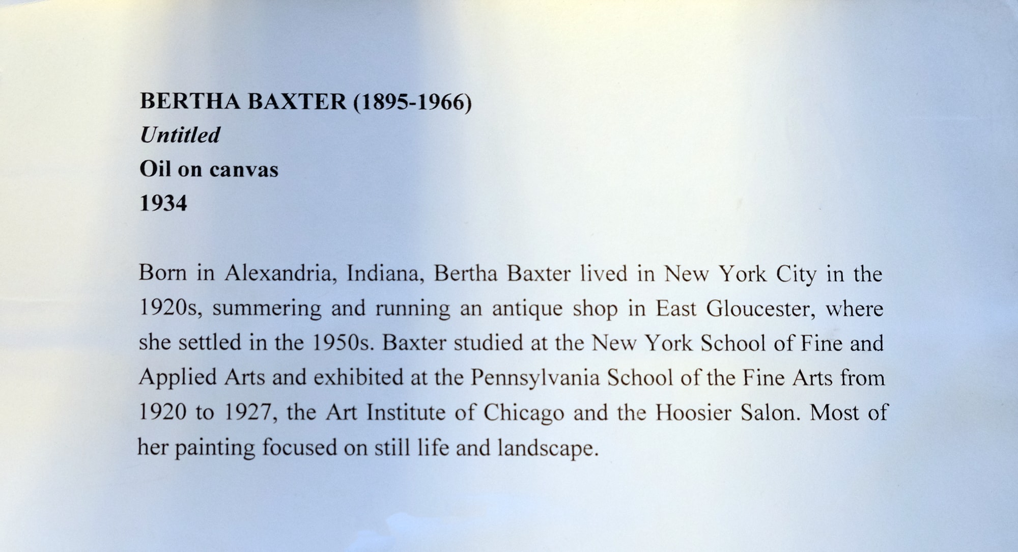 Born in Alexandria, Indiana, Bertha Baxter lived in New York City in the 1920s, summering and running an antique shop in East Gloucester, where she settled in the 1950s. Baxter studied at the New York School of Fine and Applied Arts and exhibited at the Pennsylvania School of the Fine Arts from 1920 to 1927, the Art Institute of Chicago and the Hoosier Salon. Most of her painting focused on still life and landscape.