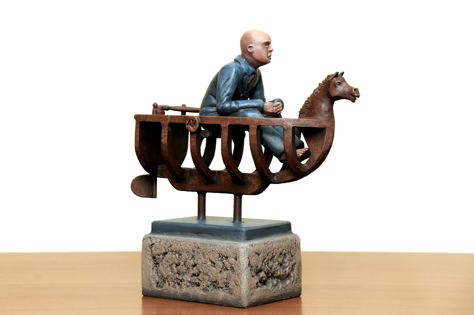 In ‘Enigma’, Albie Herbert has left the work’s narrative purposely ambiguous, enabling several possible different interpretations. The main emphasis of Herbert’s sculptural work has been to highlight environmental or social issues, though, with the case of ‘Enigma’, this piece was created for the joy of making. The images within the work are placed into unusual contexts or juxtaposed in unlikely combinations so that an unusual and novel narrative is formed, that is open to interpretation.