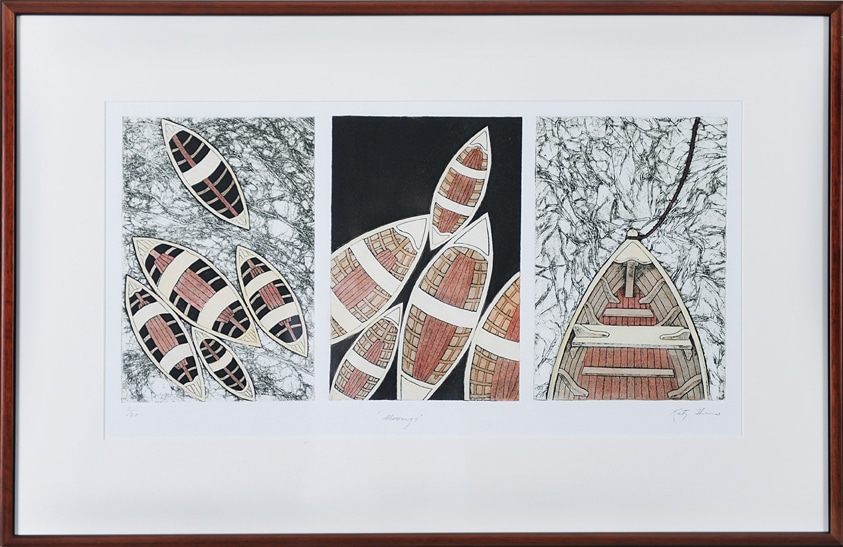 A strong autobiographical and narrative intent is evident in Kati Thamo’s work. In ‘Moorings’, from an aerial perspective, boat or dinghy shaped structures are depicted over three panels. The unusual textural quality of Thamo’s textural prints is achieved by collaging a variety of materials, especially fabric, onto a cardboard base plate, and printed.